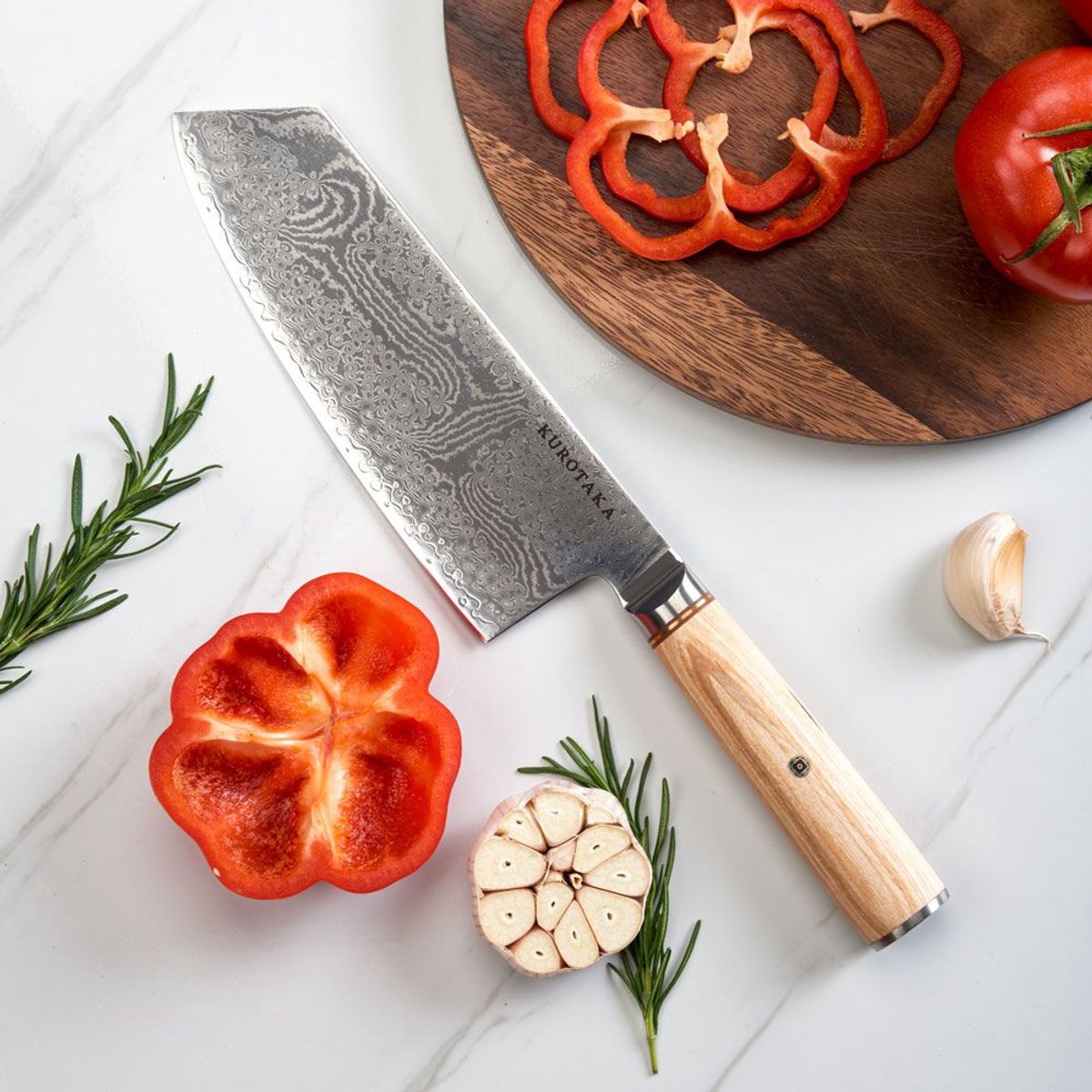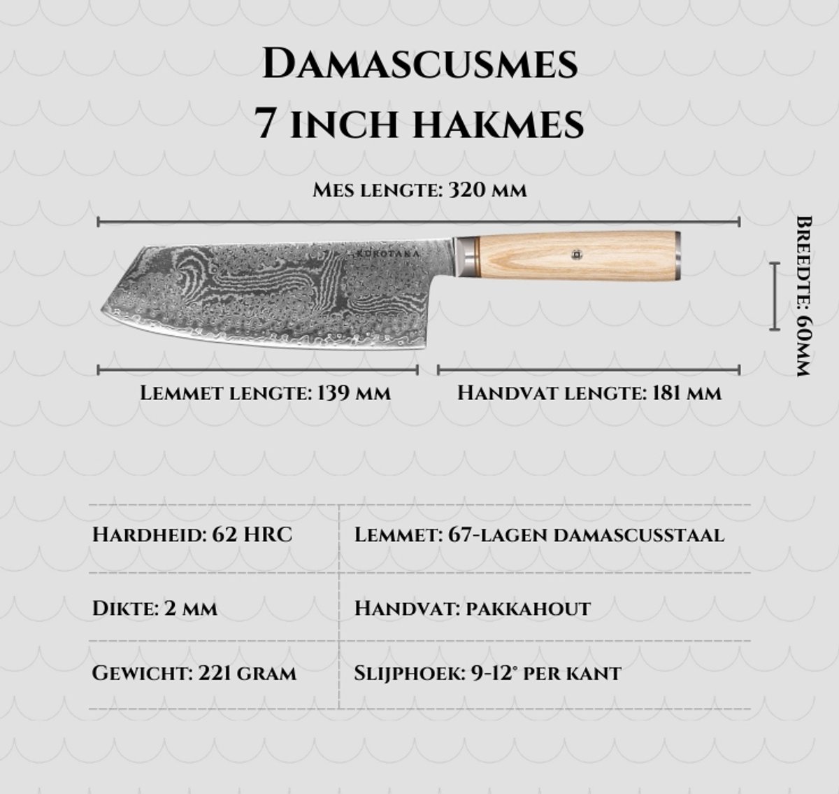- Behoud langdurige scherpte bij dagelijks gebruik, door meerlagig damascusstaal.