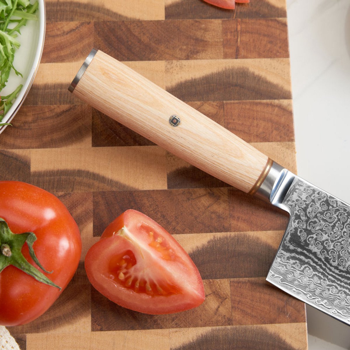 Het visuele ontwerp is nadrukkelijk: het patroon in het lemmet, de warme houten greep en de verzorgde afwerking maken het tot een blikvanger in de keuken. Toch blijft de ergonomie functioneel. De balans lijkt gericht op controle rond de snede, met een comfortabele pinch grip (duim en wijsvinger op de rug en zijkant van het lemmet bij de krop). Dat geeft directe feedback bij fijne sneden in kwetsbare groenten, zoals tomaat of kruiden.