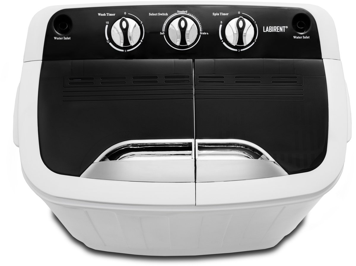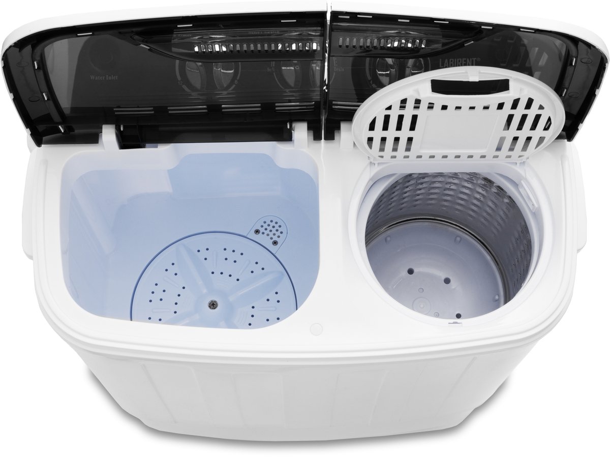 De esthetiek is neutraal en functioneel, met zwart, wit en zilverkleurige accenten. Dat maakt de mini wasmachine weinig opvallend in verschillende interieurs, van eenvoudige studentenkamers tot minimalistische keukenblokken. De dubbele trommel is overzichtelijk ingedeeld: aan de ene zijde was je, aan de andere zijde centrifugeer je. De deksels bieden directe toegang en de mechanische timers zijn intuïtief: draaien, starten, klaar.