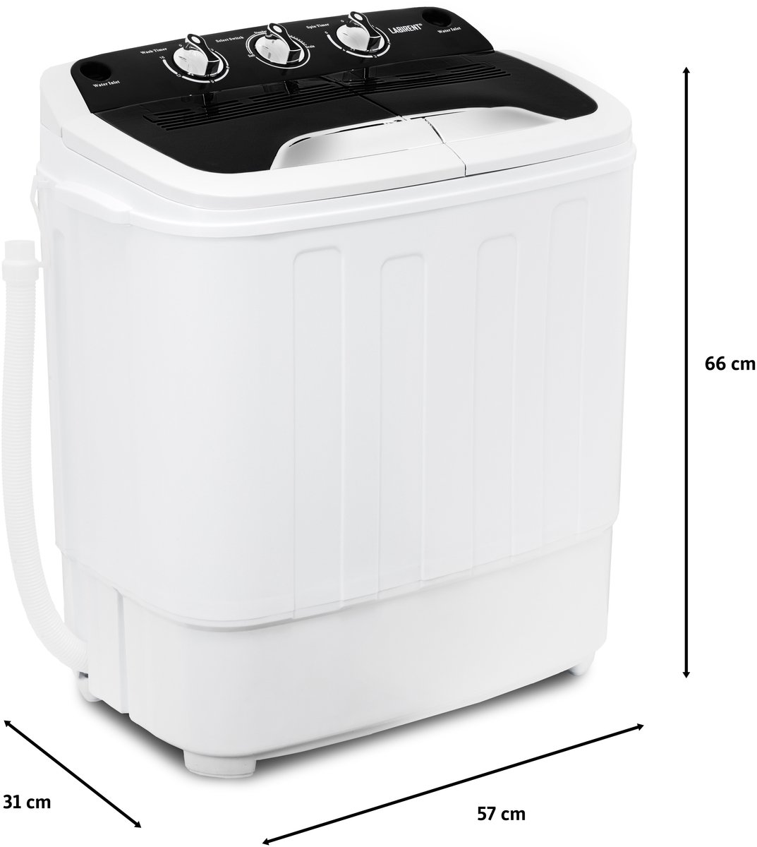 | Compact formaat (57 x 31 x 66 cm): past in kleine keukens, studentenkamers, caravan of camper | Handmatige handeling: was moet worden overgeheveld van was- naar centrifugetrommel |