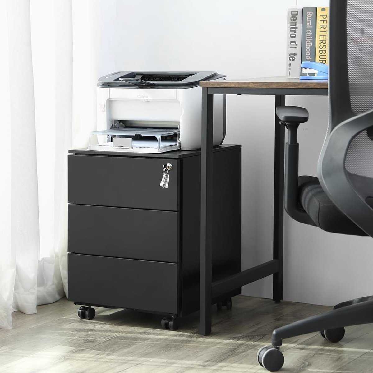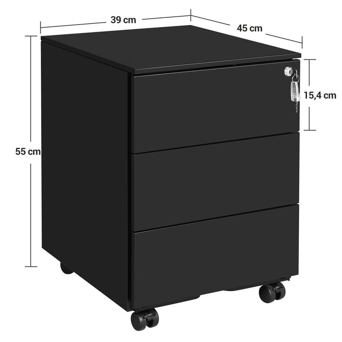 Afmetingen: 39 x 45 x 55 cm (L x B x H) (source: listing, checked 2025). Dat maakt het ladeblok compact genoeg om onder een standaardbureau te passen of naast een bureau te plaatsen zonder veel vloeroppervlak in te nemen.