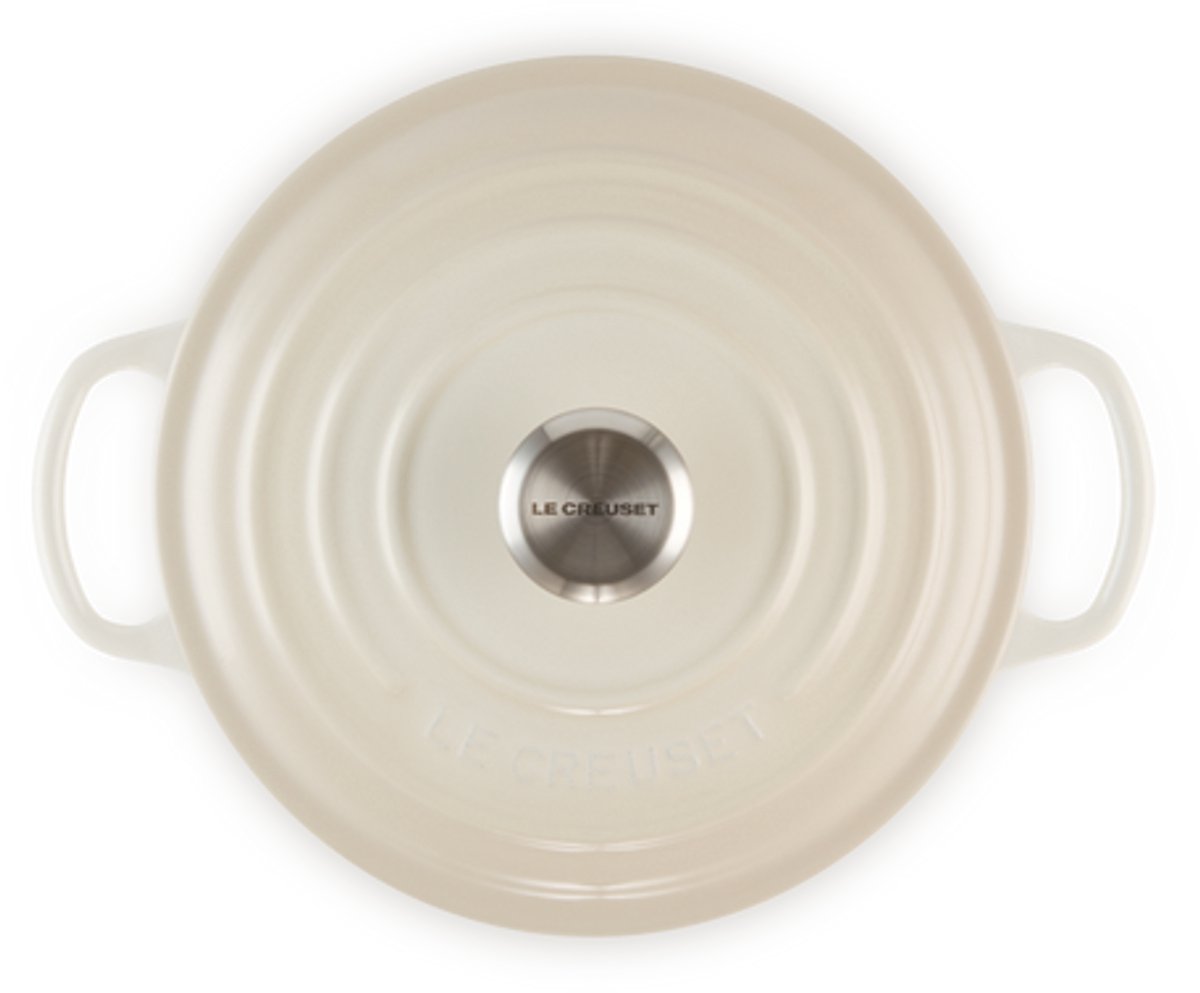 De Le Creuset braadpan Signature in de kleur Meringue is een klassieke gietijzeren braadpan met een crèmewitte emaillelaag en een inhoud van 4,2 liter. Deze pan is bedoeld voor wie regelmatig voor meerdere personen kookt en waarde hecht aan gelijkmatige warmteverdeling, duurzaamheid en een nette uitstraling die direct op tafel kan.