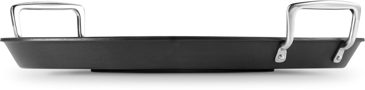 De pan is vervaardigd van gegoten aluminium, een materiaal dat bekendstaat om zijn vermogen warmte snel op te nemen en gelijkmatig te verdelen over het oppervlak. Dit zorgt voor een consistente baktemperatuur over de gehele bodem en langs de zijkanten, wat belangrijk is bij delicate producten zoals vis. Het gebruik van dit materiaal maakt de pan doorgaans lichter in gewicht vergeleken met traditioneel gietijzer, wat de wendbaarheid en het hanteren vergemakkelijkt tijdens het koken of serveren.
