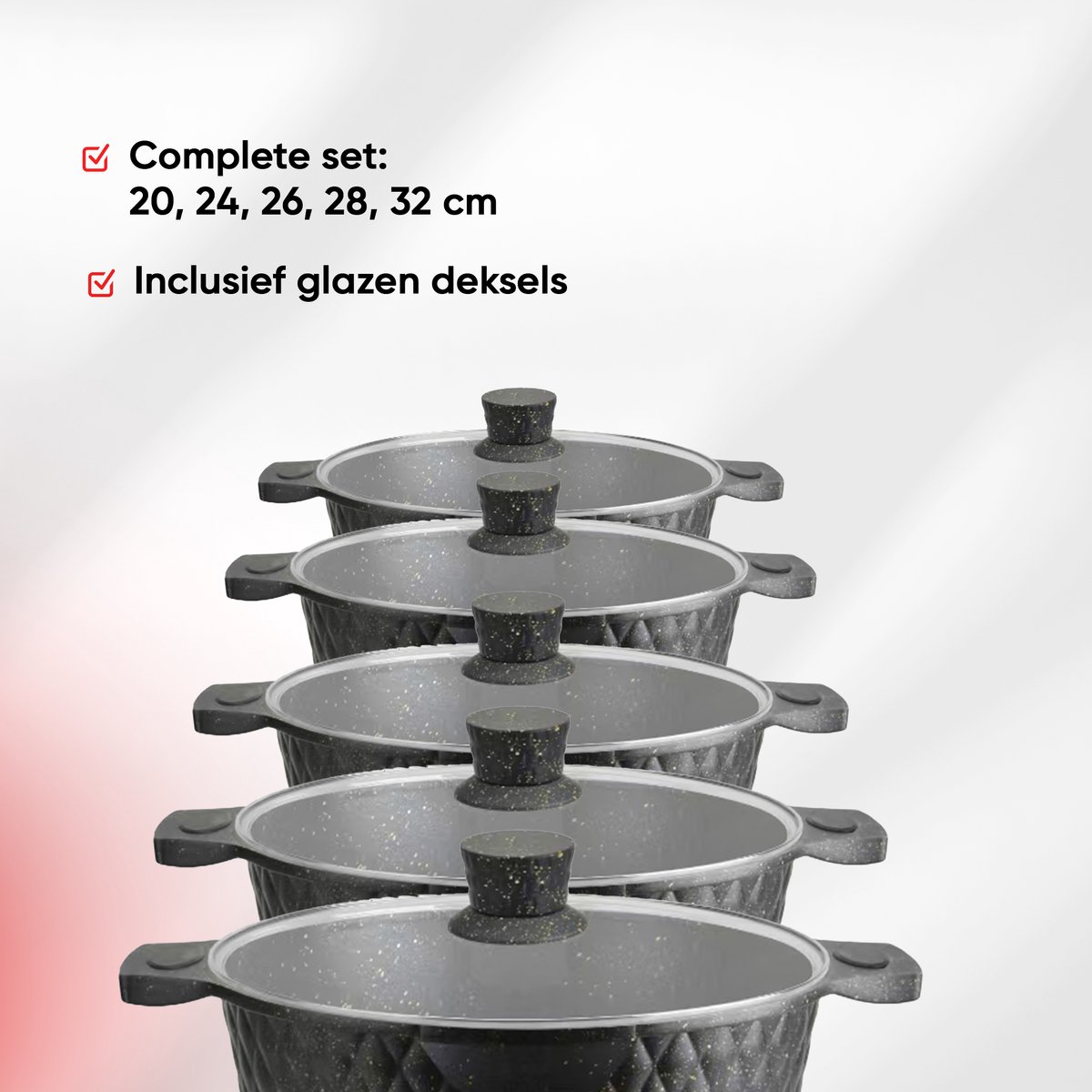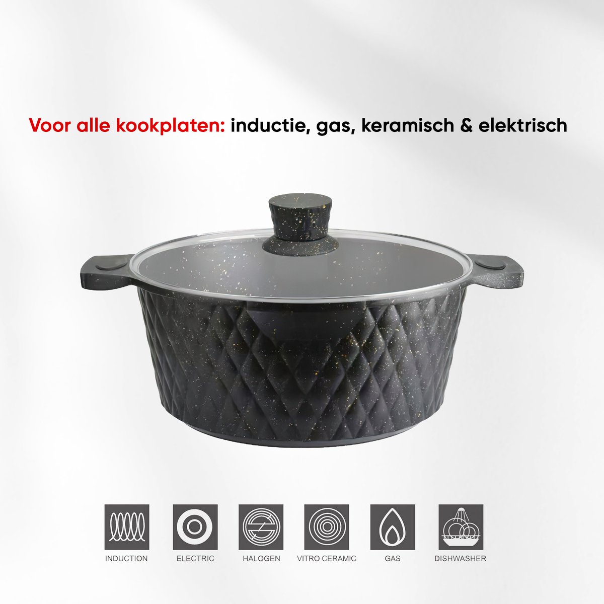 De Leumx-set is vervaardigd uit gegoten aluminium, wat doorgaans zorgt voor een solide en relatief zware constructie in vergelijking met dunner plaatmateriaal. Dat zwaartegevoel werkt in het voordeel van stabiliteit op het fornuis en bevordert gelijkmatige warmteverdeling. De buitenzijde heeft een zwart granietdesign met diamantstructuur; zichtbaar aantrekkelijk en ontworpen om zowel moderne als klassieke keukens te complementeren.