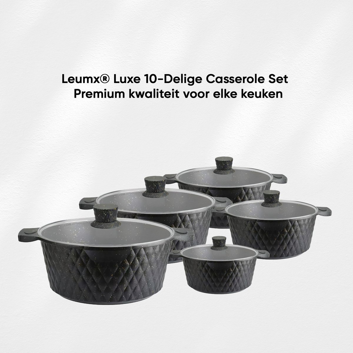 De Leumx 10-delige casserole pannenset is een complete set kookgerei voor wie stijl en functionaliteit wil combineren. De set bestaat uit vijf verschillende pannen met bijpassende glazen deksels en belooft duurzaam koken dankzij gegoten aluminium en een stevige marmeren anti-aanbaklaag. Deze set richt zich op thuiskoks die een luxe, veelzijdige pannenset zoeken die op alle warmtebronnen werkt.
