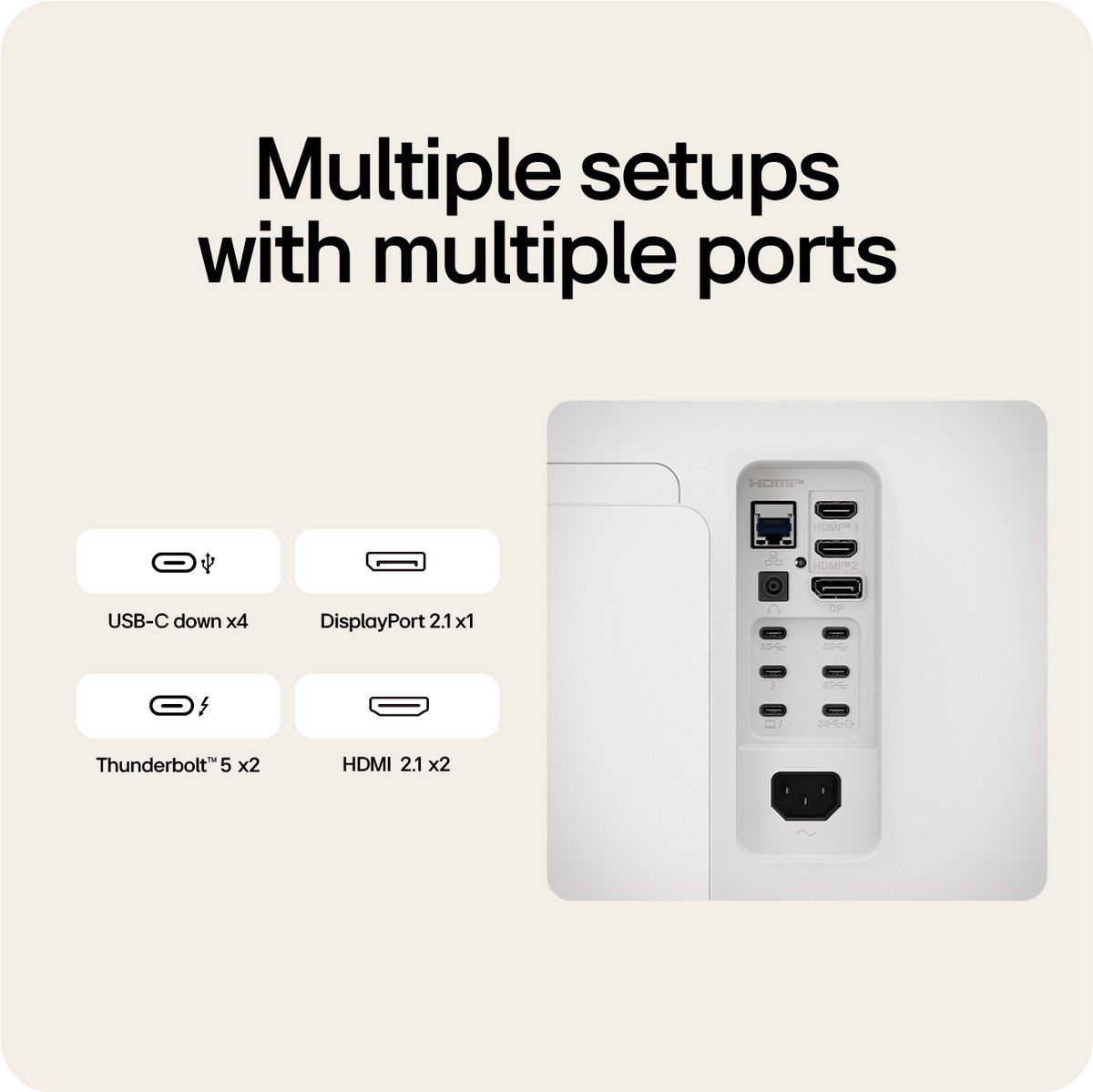 - Eén kabel voor alles: beeld, data, netwerk en stroom. De monitor levert voeding via de Thunderbolt 5-verbinding (exact vermogen niet gespecificeerd), zodat je laptop kan worden opgeladen terwijl je werkt.