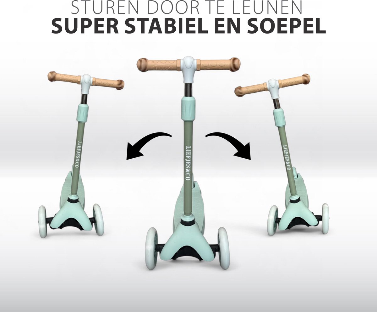 De Ziggy kinderstep van Liefjes & Co is een compacte, stabiele step voor jonge kinderen. Hij heeft drie wielen, lichtgevende wielen zonder batterijen en een in hoogte verstelbaar stuur, waardoor hij bedoeld is voor kleuters die leren balanceren en zelfstandig korte ritjes maken.