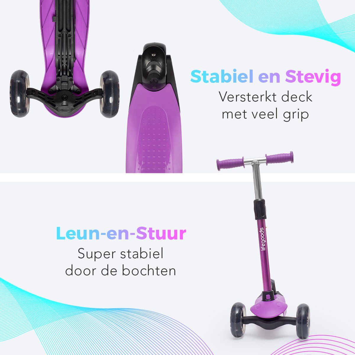 De LifeGoods kinderstep heeft een frame van aluminium en drie wielen van PU-materiaal (85A) met ABEC 5-lagers. Het aluminium maakt de step opmerkelijk licht met een totaalgewicht van ongeveer 2,2 kg (bron: productpagina, gecontroleerd 2025), waardoor hij makkelijk te dragen is over stoepranden of in en uit de auto. De step is verkrijgbaar in vier kleuren: roze, blauw, paars en zwart — keuzevrijheid voor kleur zonder dat de technische basis verandert.