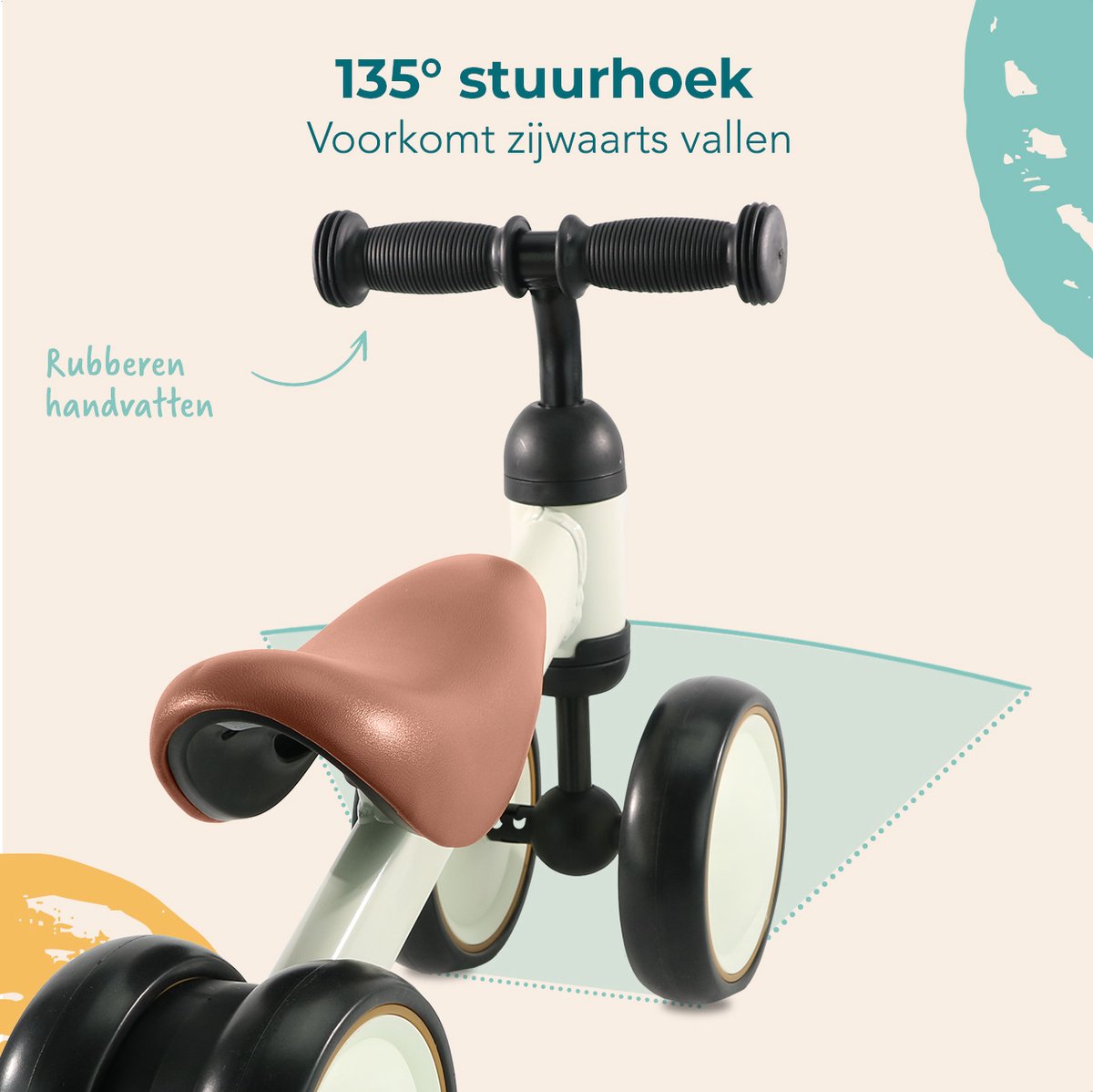 Er wordt benadrukt dat de wielen speciaal zijn behandeld om krassen te voorkomen. Deze antikras-wielen maken de loopfiets geschikt voor binnengebruik op vloeren die je niet wilt beschadigen, zoals parket of tegels. Tegelijkertijd zouden ze buiten geschikt moeten zijn voor trottoirs en zachte ondergronden.