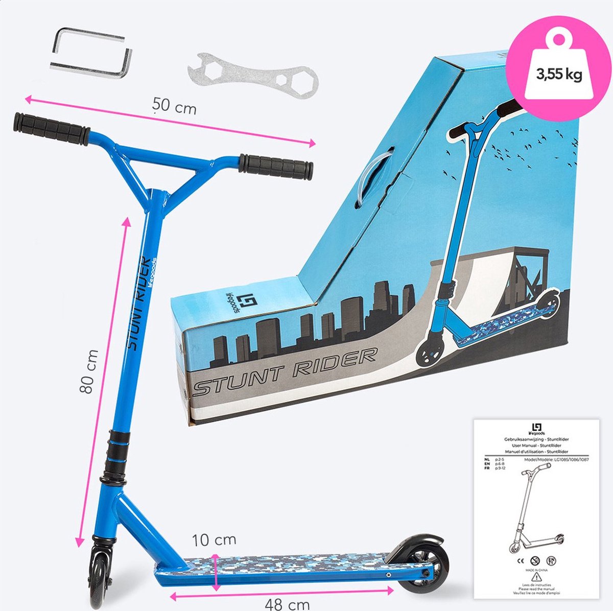 De LifeGoods StuntRider is een stuntstep ontworpen voor kinderen en tieners die willen oefenen met tricks en springen. Het is een compacte, relatief lichte stuntstep met een versterkt deck dat 360° kan draaien, een Y-vormig stuur en 100 mm PU-wielen met ABEC 7-lagers. Kort gezegd: een instap- tot middenklasse stuntstep voor recreatief stuntgebruik.