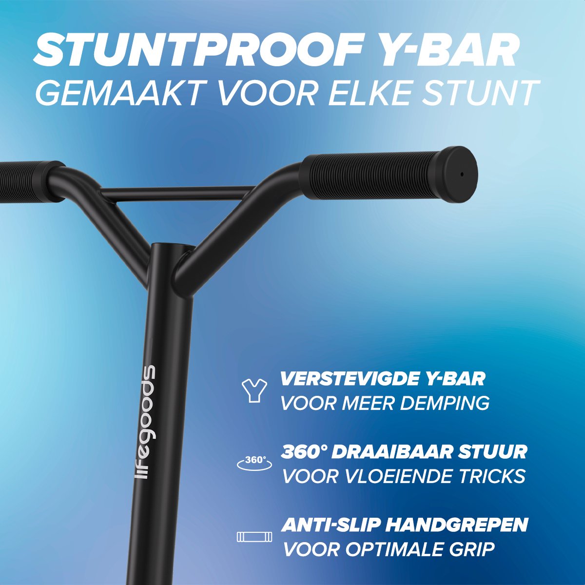 Overzicht:De LifeGoods Stuntstep Fly Pro is een lichtgewicht stuntstep waarmee Nederlandse kinderen vanaf 6 jaar snel tricks leren dankzij optimale controle. Met een ruim deck van 48 x 11 cm, 100mm PU-wielen en een sterke aluminium Y-stang biedt hij duurzame prestaties en soepele ritten.