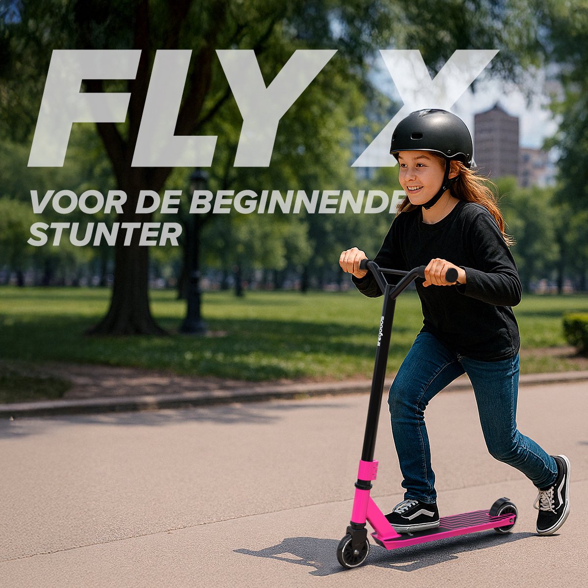 De LifeGoods Stuntstep Fly X is een lichtgewicht stuntstep die is ontworpen om kinderen vanaf ongeveer 6 jaar te helpen tricks te leren en te oefenen in het skatepark of op straat. Hij combineert een breed stuur, een ruim deck en relatief grote wielen om stabiliteit en controle te bieden tijdens sprongen en landingen.