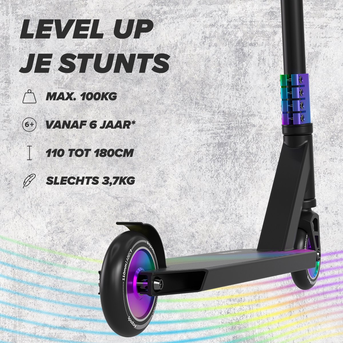 Overzicht:De LifeGoods Stuntstep Pro X is een robuuste stuntstep, ideaal voor Nederlandse rijders die het skatepark willen domineren. Met 110mm PU-wielen en ABEC-9 lagers biedt hij extra snelheid en vloeiende rol.