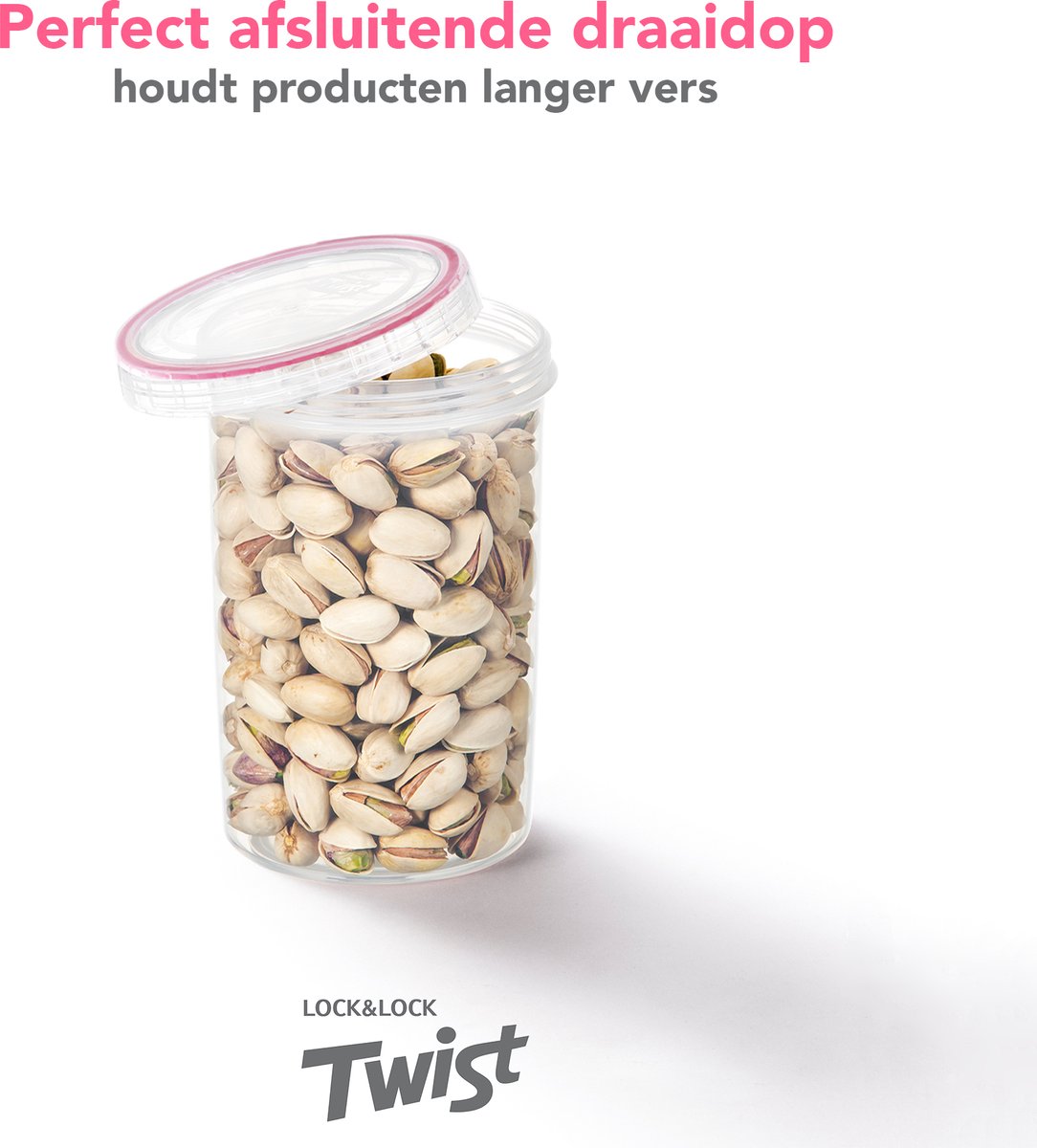 De LocknLock Twist voorraadbussen zijn compacte bewaardozen met een draaidop, ontworpen om orde te scheppen in je keuken en (koel)kast. Ze zijn volgens de aanbieder ideaal voor droogwaren zoals specerijen en noten, en bovendien geschikt voor kleinere (snack)groente en fruit. Het bijzondere aan deze serie is dat alle bussen dezelfde bodemmaat hebben, zodat je ze strak en stabiel kunt stapelen.