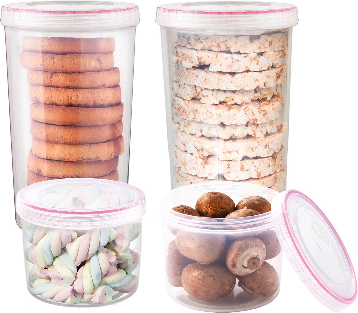 De LocknLock Twist voorraadbussen zijn ronde, transparante bewaardozen met een draaideksel en siliconenring, ontworpen om je etenswaren echt luchtdicht en georganiseerd te bewaren. Deze vierdelige set combineert twee formaten (940 ml en 1,9 liter) met dezelfde bodemmaat, zodat je ze strak op elkaar kunt stapelen en direct ziet wat erin zit. Ideaal voor alles van pasta en muesli tot verse groente, fruit en zelfs een rol beschuit.