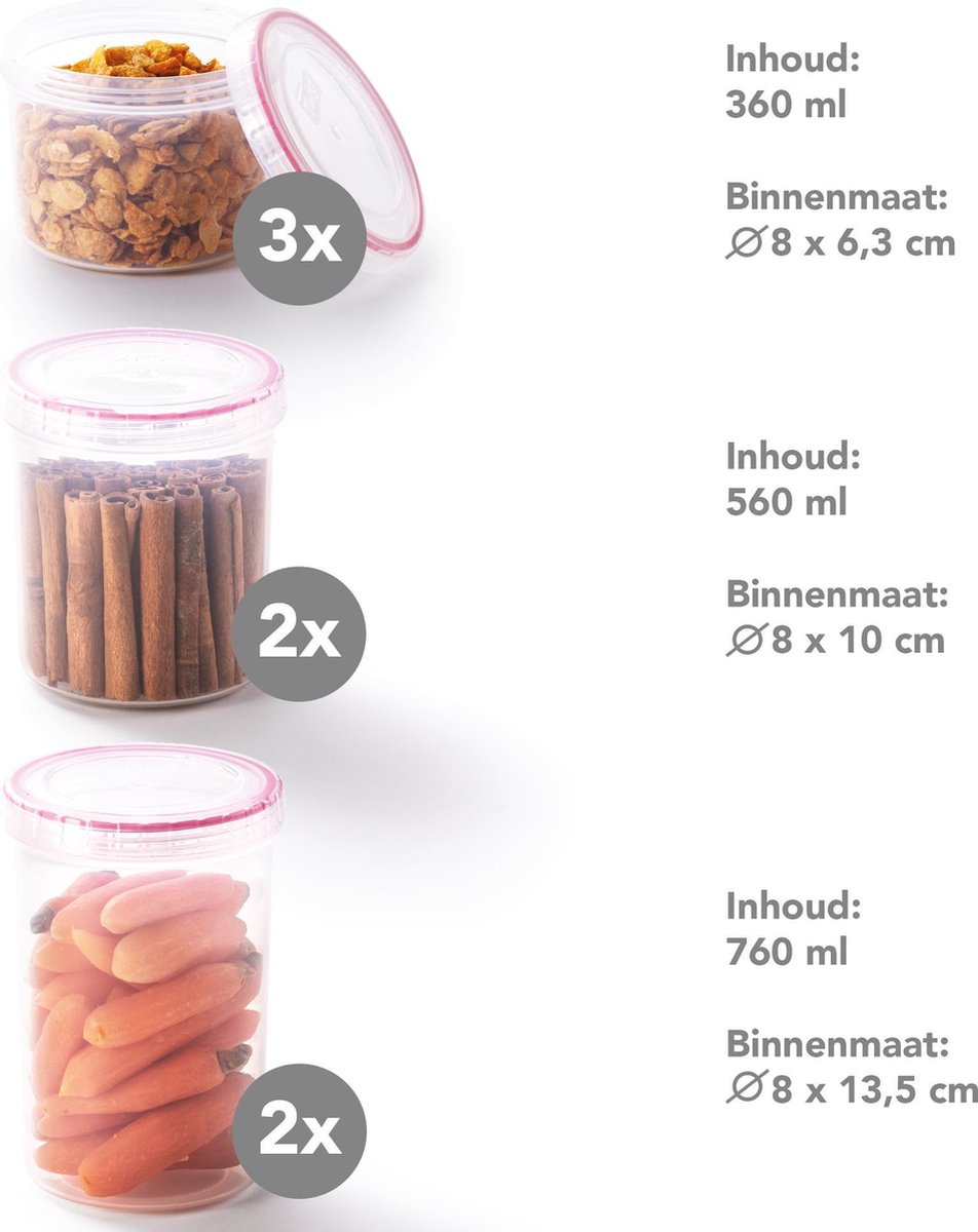 - Organiseer elk gerecht en restje, met 7-delige set: 3×360, 2×560, 2×760 ml.
