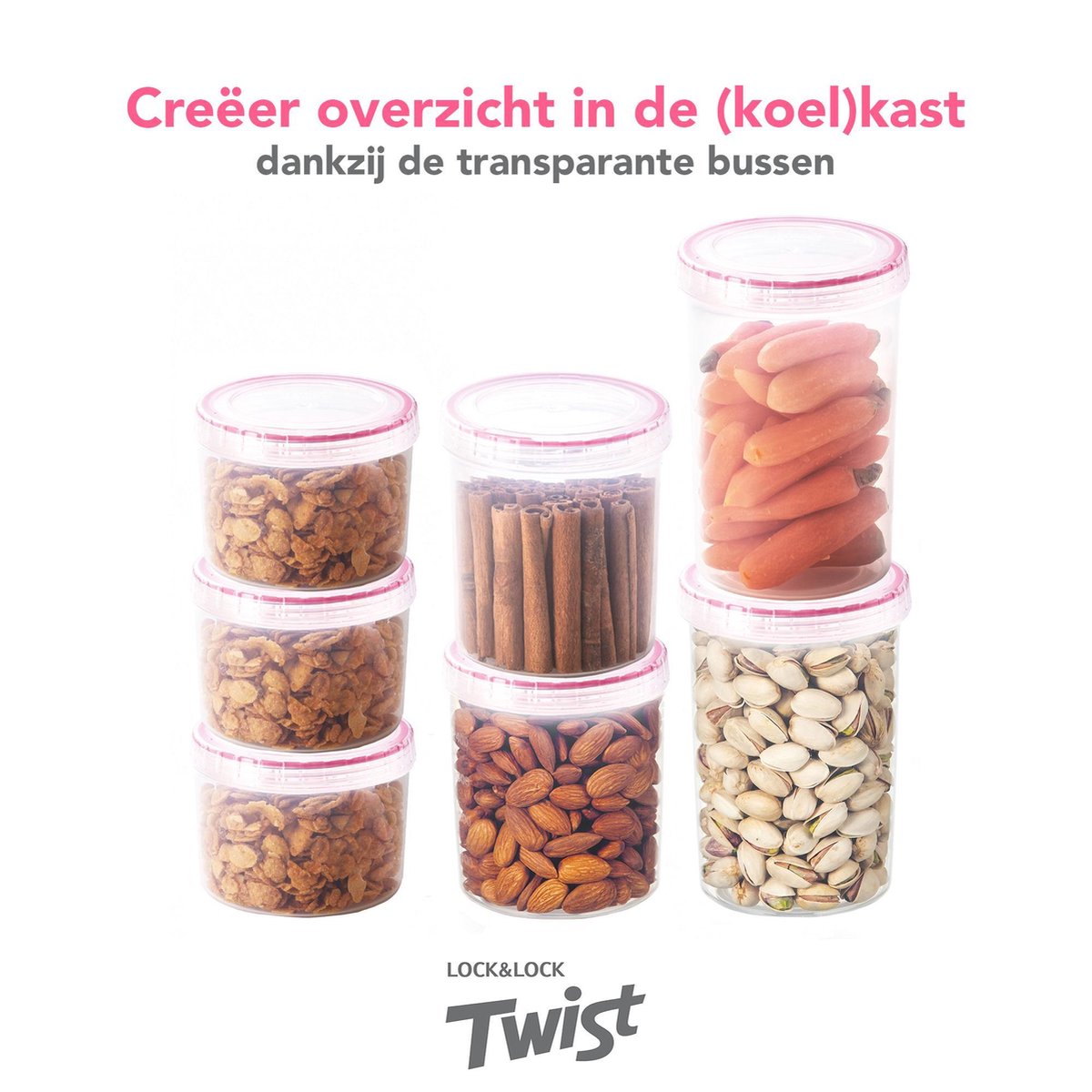 De LocknLock Twist voorraadbussen zijn een 7-delige, stapelbare set voor overzicht en versheid in je keuken. Dankzij de draaideksel met siliconenring blijven etenswaren 100% luchtdicht bewaard; geschikt voor magnetron (zonder deksel), diepvries en vaatwasser.