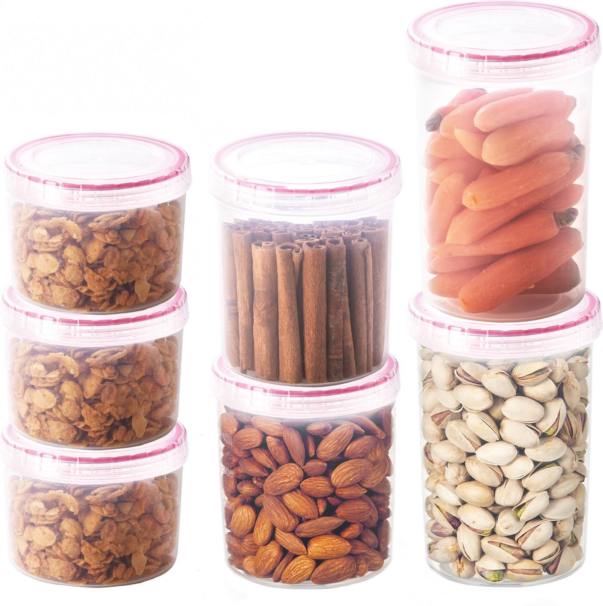 De LocknLock Twist voorraadbussen zijn een 7-delige set ronde bewaardozen met draaideksels en siliconenafdichting, ontworpen om etenswaren langer vers te houden en je keukenkasten, koelkast en vriezer overzichtelijk in te delen. Dankzij de gelijke bodemmaat bouw je stabiele torens en zie je door het heldere materiaal direct wat je nog in huis hebt.