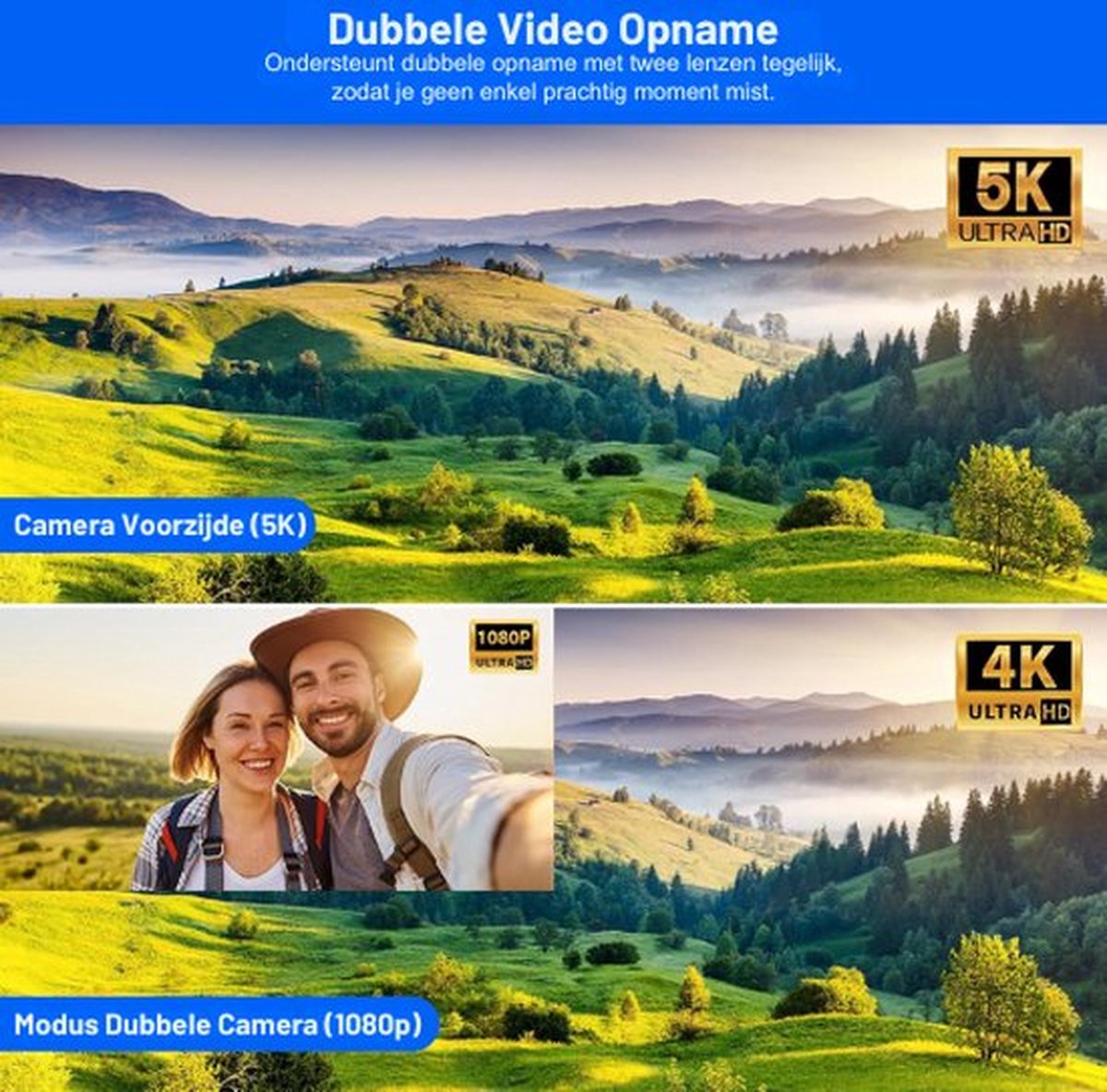 De dubbele lensopstelling maakt het mogelijk om tegelijk in twee resoluties op te nemen — bijvoorbeeld 4K en 1080p tegelijk. Dit is handig als je tijdens opname meteen een lagere-res figuur of livestream versleuteling wilt doorsturen terwijl je de hoge-res master bewaart. Dit kenmerk noemen we als “dubbele lens” omdat het twee opnamepaden ondersteunt (bron: listing, gecontroleerd 2025).