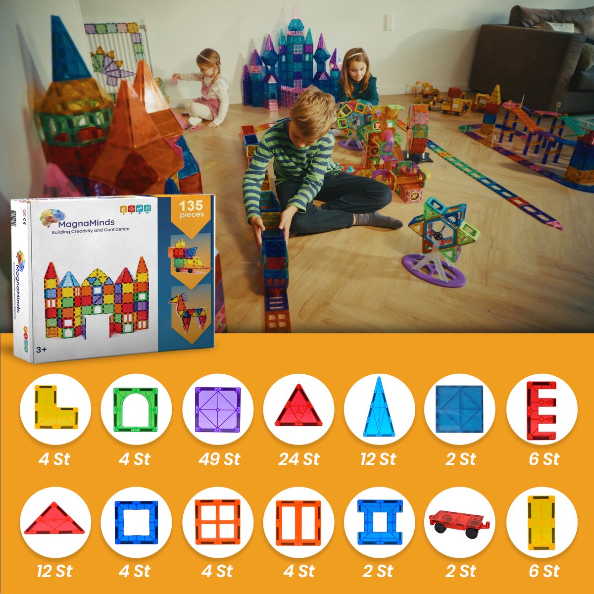 Deze magnetische bouwset van Magnaminds is magnetisch speelgoed dat creativiteit en spelenderwijs leren stimuleert, ideaal voor Nederlandse gezinnen. De set bevat 135 stuks inclusief twee auto-onderstellen en een instructieboekje, compact op te bergen en gemakkelijk mee te nemen.