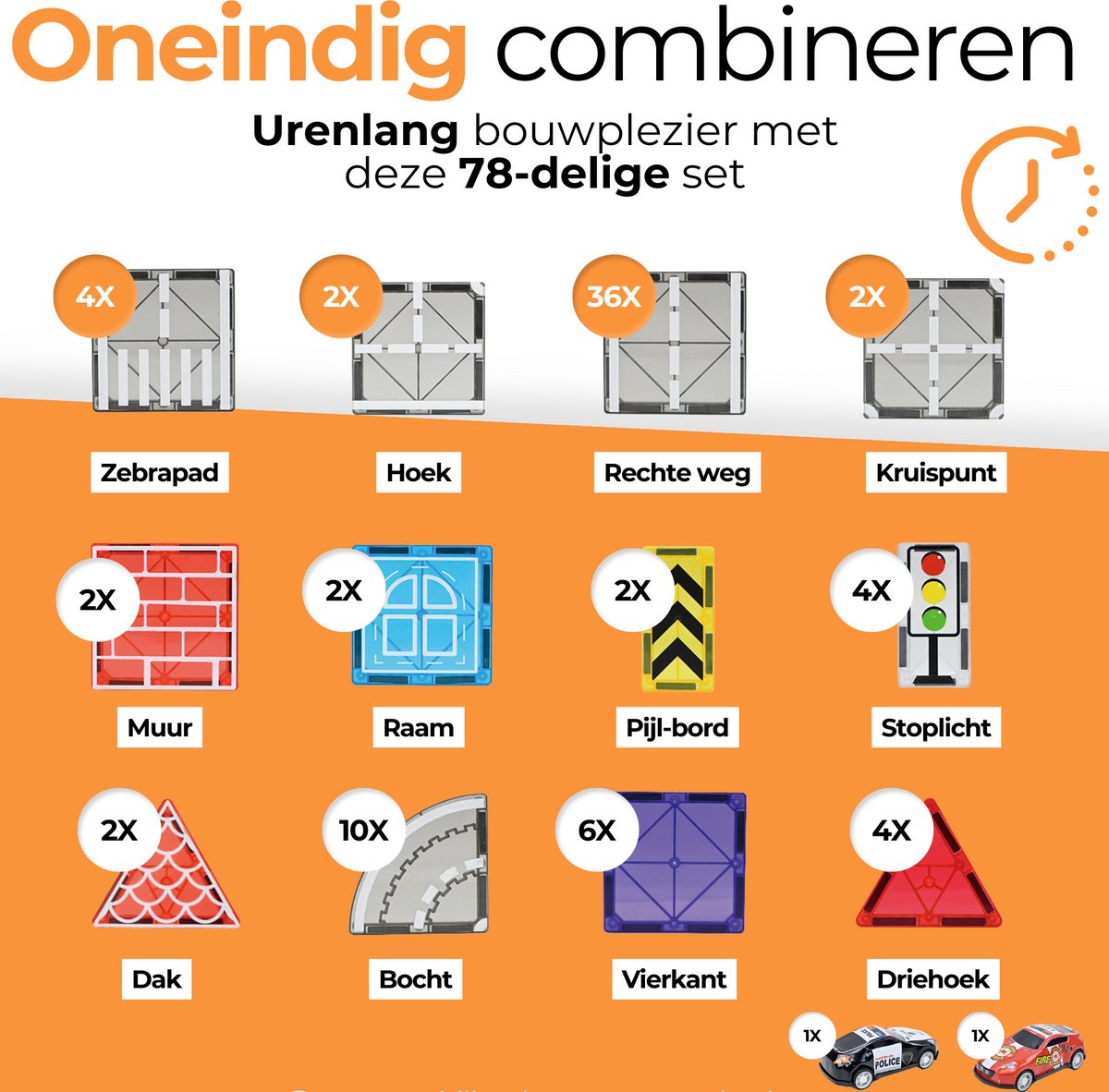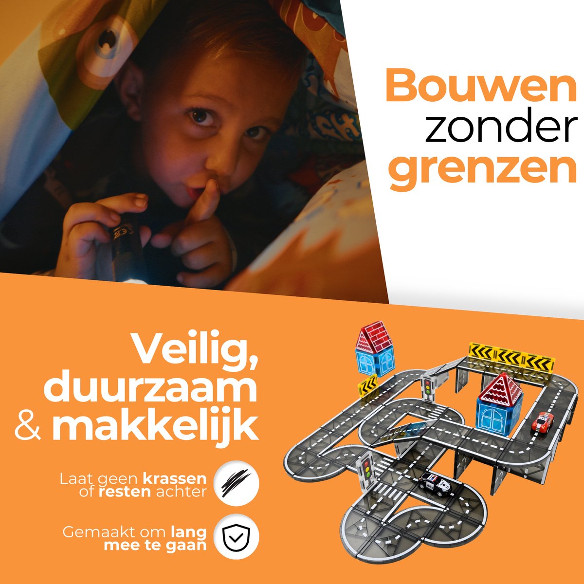- Uitbreiden: combineer met andere magnetische bouwsets voor grotere projecten. Omdat de onderdelen compatibel zijn, kun je gemakkelijk wegen doortrekken of een heel nieuwe wijk maken.
