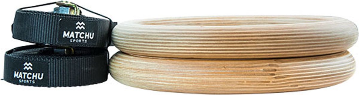 De houten turnringen van Matchu Sports zijn een set gymringen met bijbehorende, verstelbare ophangbanden waarmee je turn- en calisthenics-oefeningen thuis of in de buitenruimte kunt doen. Het gaat om twee houten ringen met nylon banden, bedoeld voor lichaamsgewichttraining zoals pull-ups, dips, chin-ups en statische houdingen. (bron: listing, gecontroleerd 2025)
