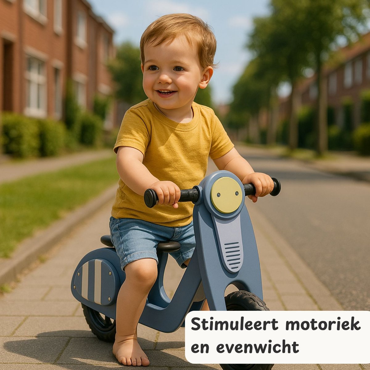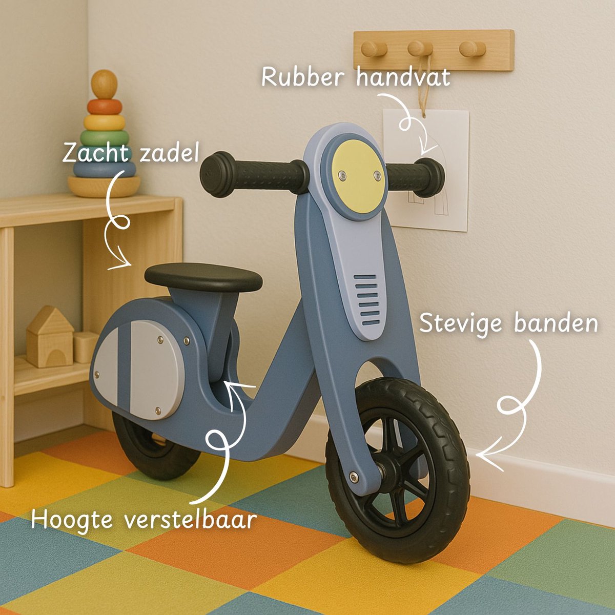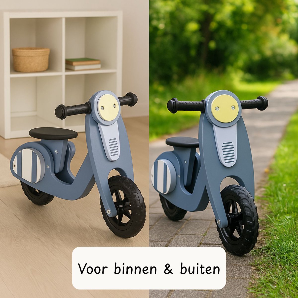 Het retro-design met subtiele blauwe accenten is bedoeld om zowel kinderen als ouders aan te spreken. Een nette afwerking zorgt ervoor dat de loopfiets er thuis ook netjes uitziet wanneer hij in het interieur staat.