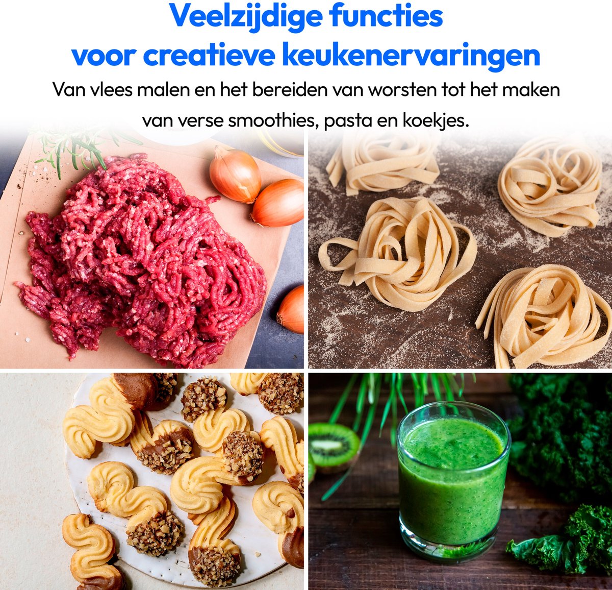 Zelf gehakt draaien betekent controle over vetpercentage en versheid. Met het bijgeleverde hulpstuk maak je je eigen burgerblend, saucijs- of kebabmengsel. Handig als je eens variatie wilt met rund, kip of een mix met kruiden. Het is ook aantrekkelijk voor wie graag verspilling voorkomt: restjes vlees verwerken wordt eenvoudig.