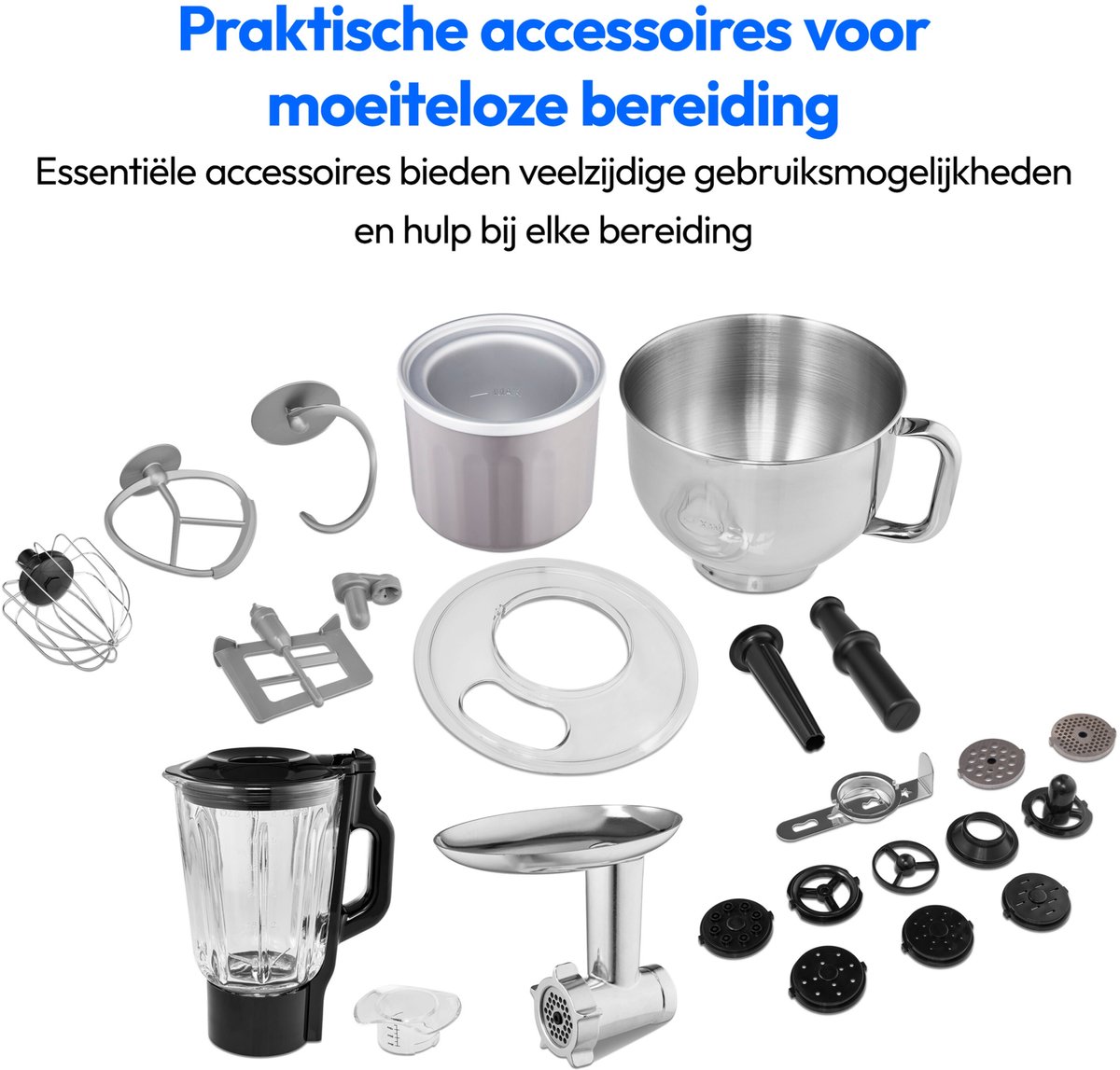 Meerdere hulpstukken meegeleverd: malen, mixen en ijs bereiden Door de extra hulpstukken is meer opbergruimte nodig