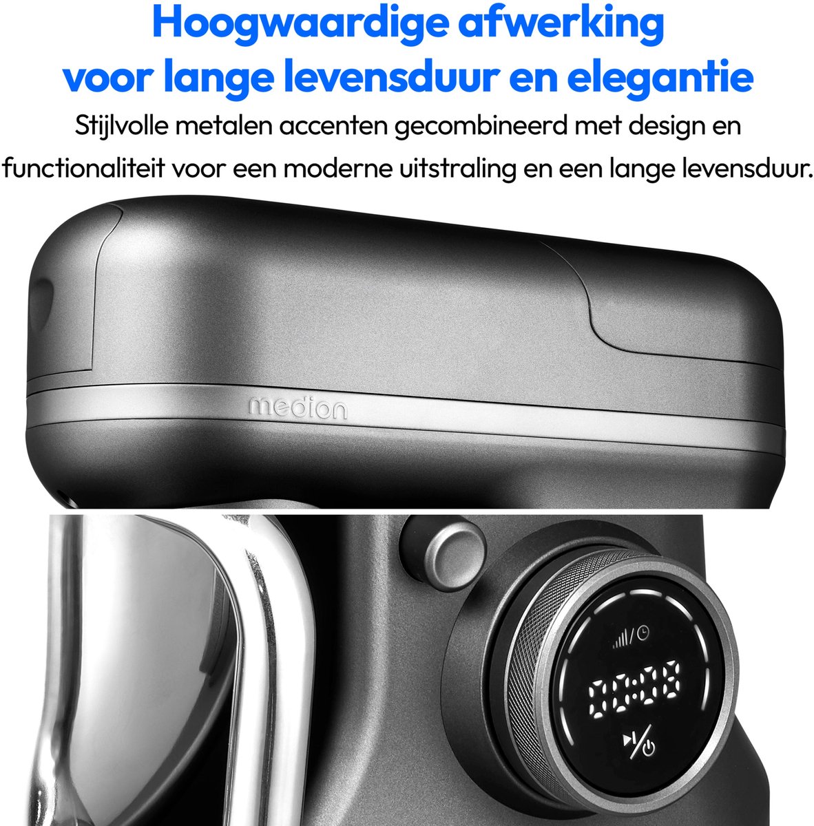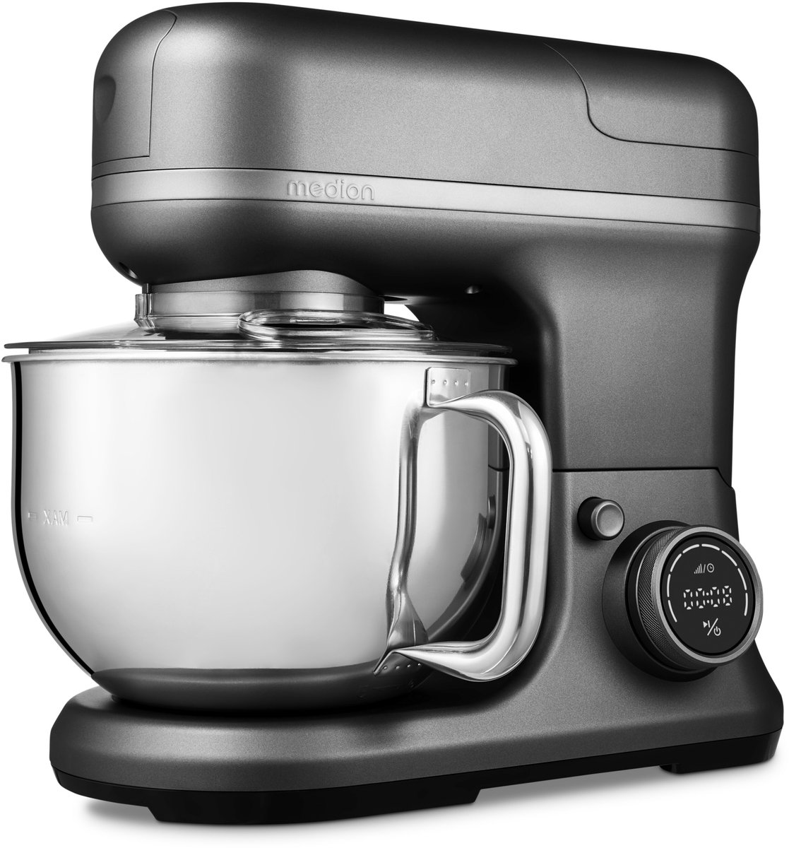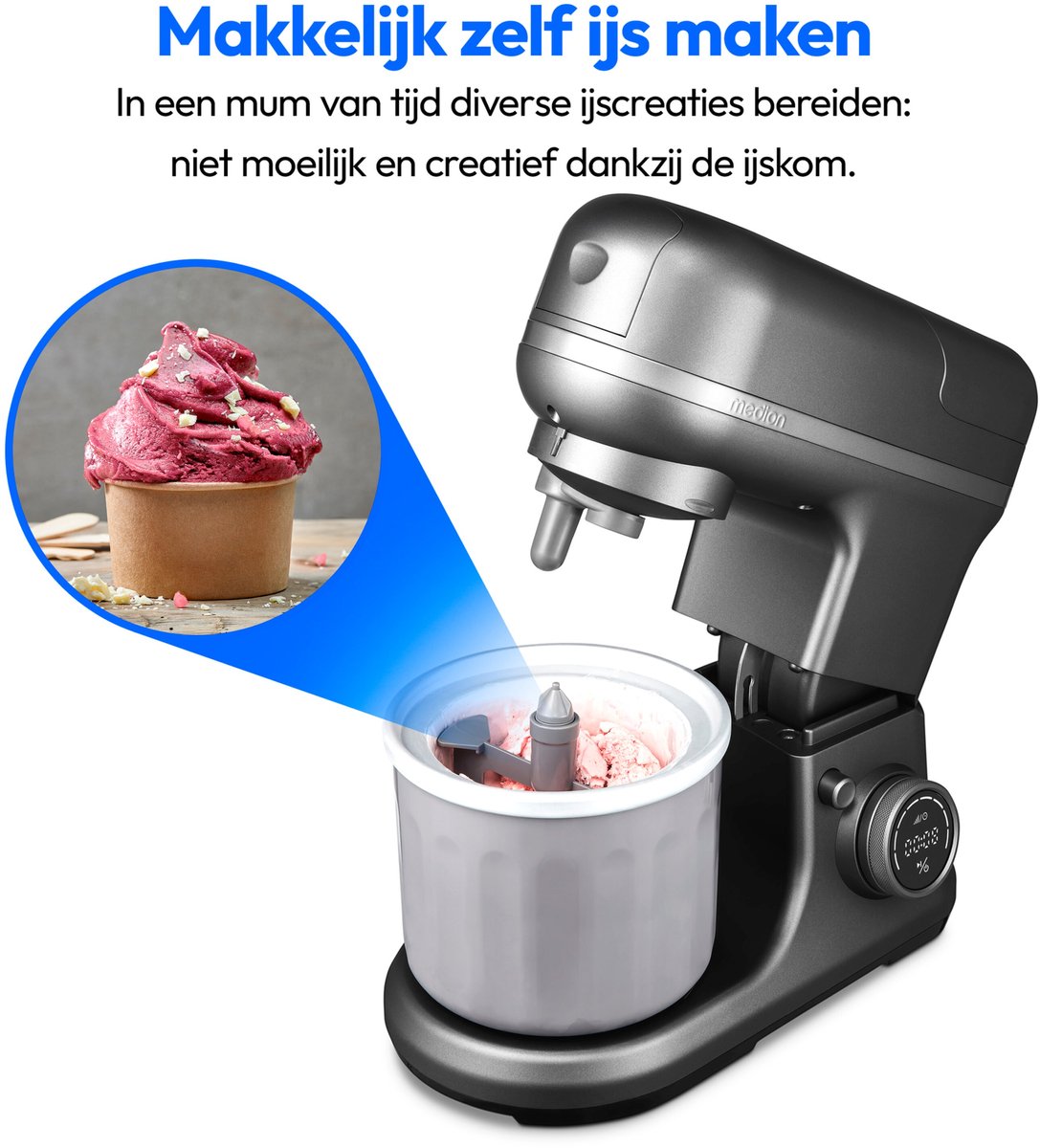Stel Notificatie voor Product in: MEDION 4 in 1 universele keukenmachine (1200 watt, 8 standen, mengen kneden roeren hakken, ijskom voor het bereiden van ijs, digitaal display, MD18440) Titanium - €119,95
