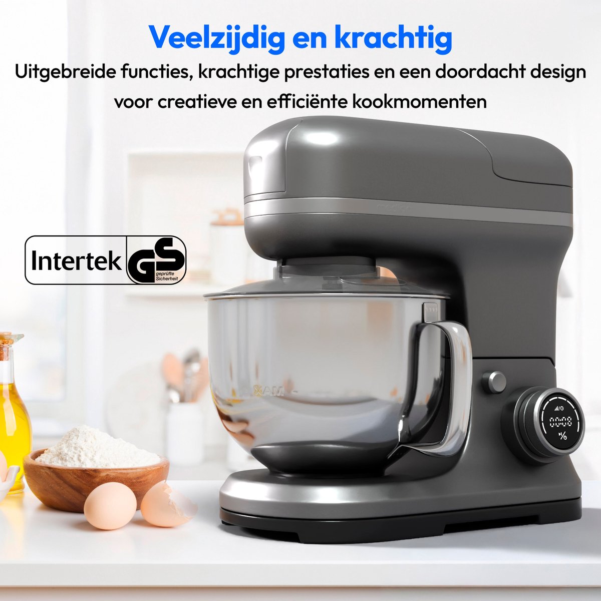 De grote kom van vijf liter is een praktisch voordeel. Voor gezinnen of maaltijdvoorbereiders betekent dat: grotere deegballen in één keer, of beslag voor meerdere lagen cake zonder extra rondes. Tegelijk vraagt zo’n grote kom wel wat kastruimte; de machine is bedoeld om te blijven staan op het werkblad. Als je een compacte keuken hebt, is dat goed om vooraf te bedenken.