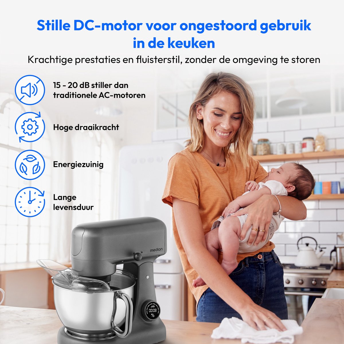 De keukenmachine is uitgerust met een 800 watt gelijkstroommotor die krachtig én efficiënt werkt (bron: listing, gecontroleerd 2025). Gelijkstroommotoren staan erom bekend dat ze koppel op lage toerentallen leveren. In de praktijk merk je dat bij het kneden van stevig brood- of pizzadeeg en bij het verwerken van zwaardere ingrediënten zoals noten of vlees voor gehakt. De machine is daarbij volgens de listing “bijzonder stil”, wat ‘s avonds prettig is als je nog even deeg wilt draaien terwijl er een serie opstaat.