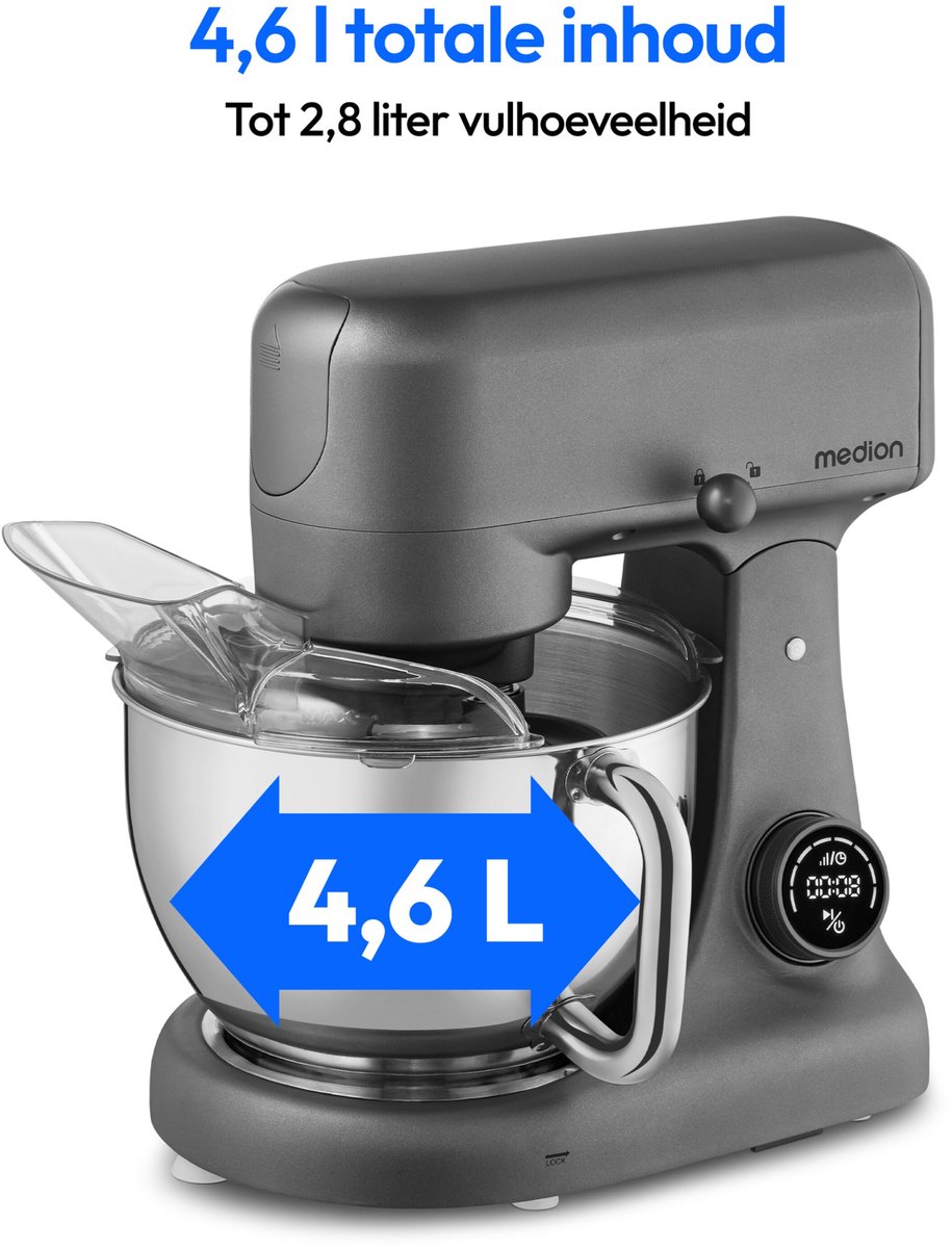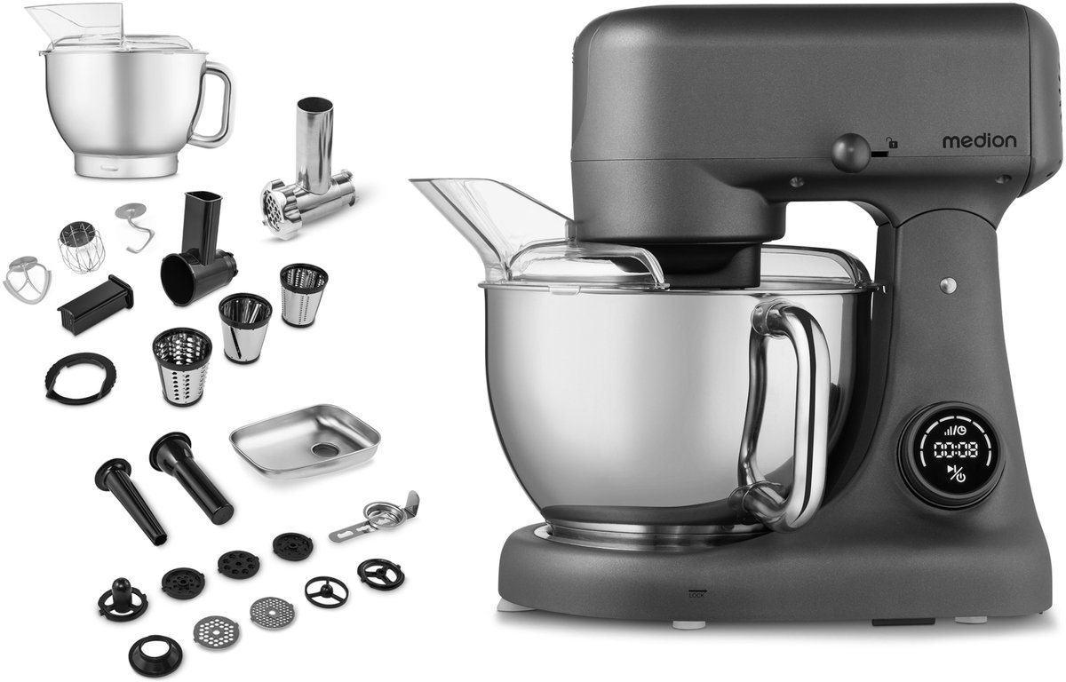 Stel Notificatie voor Product in: MEDION keukenmachine met vleesmolen (800 watt, gelijkstroommotor, roestvrijstalen kom van 4,6 liter, energiebesparend, zeer stil, digitaal sensor-touchdisplay, MD12600) Titanium - €179,95