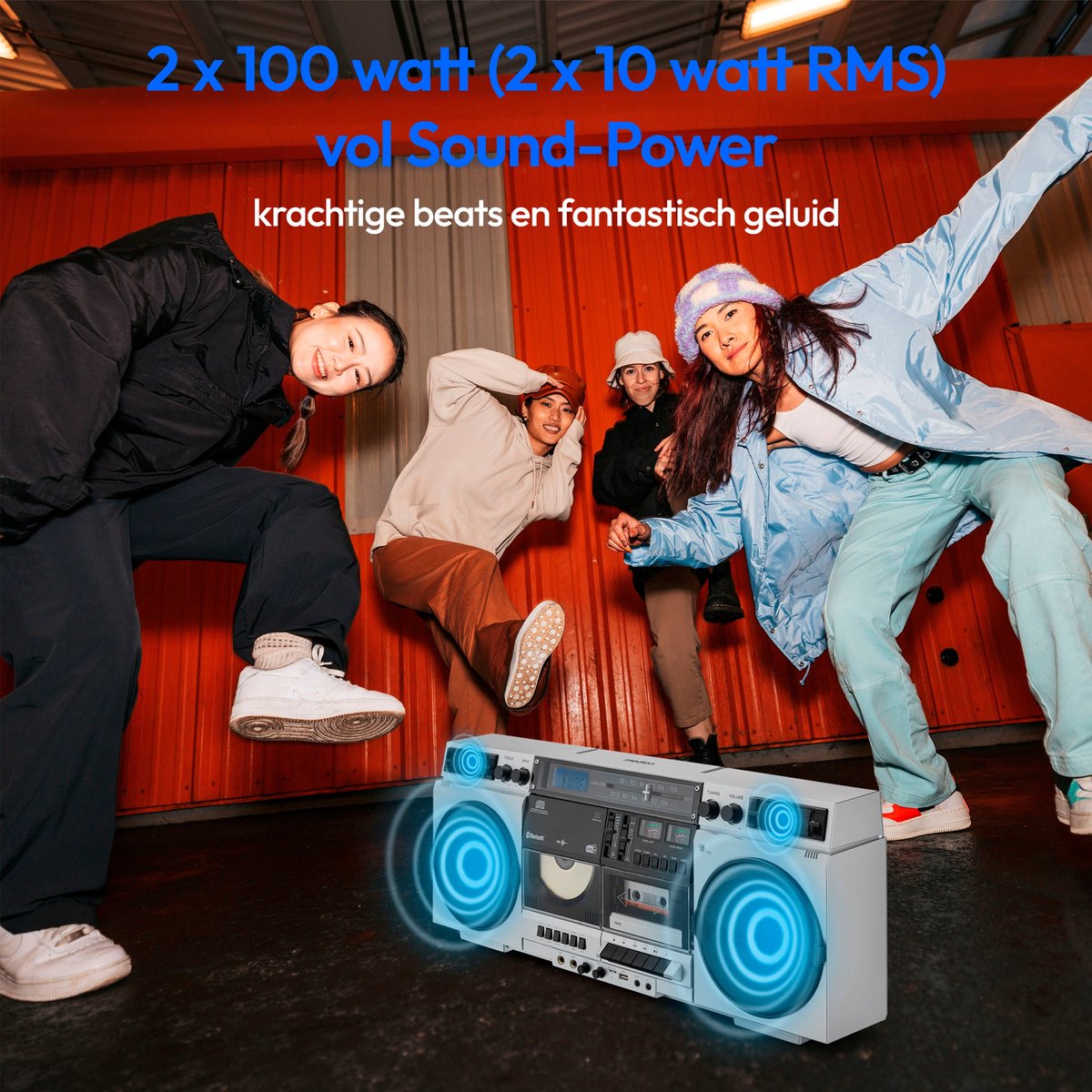 Ik ben erg blij met mijn Ghetto Blaster — echte nostalgie. Voorzien van cd- en cassettespeler, FM/DAB-radio, microfooningang, USB en SD. Het geluid is prima met extra bas. Positieve punten: compleet audiosysteem met alles bij elkaar en een goede sound.