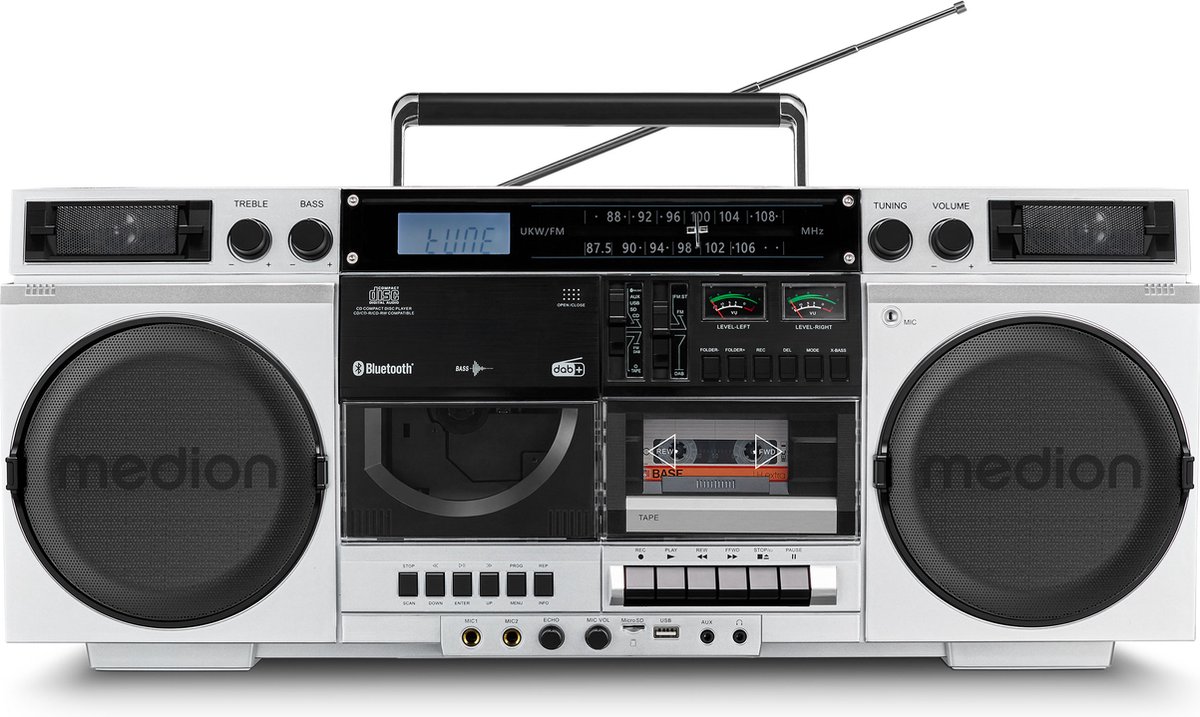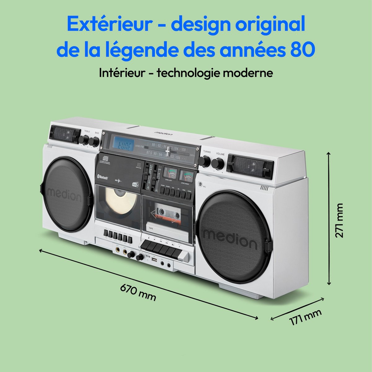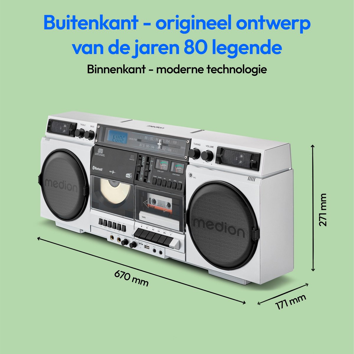 Speelt cd’s, MP3‑bestanden en heeft een volledig cassettedeck voor nostalgie Geen specificaties over luidsprekerkwaliteit of RMS‑vermogen in de productinformatie
