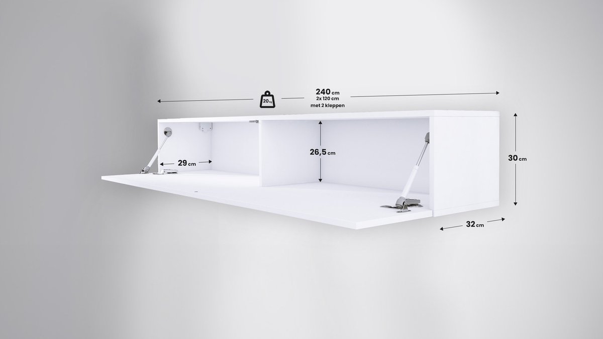Achter de strakke kleppen is genoeg ruimte voor apparatuur zoals een decoder, spelconsole of mediaspeler. Omdat het meubel zwevend is, kunt u kabels netjes achter het meubel langs of naar een verborgen kanaal leiden. Controleer wel waar eventuele openingen of uitsparingen voor kabels zijn: deze zijn in de listing niet expliciet genoemd. (Not specified)