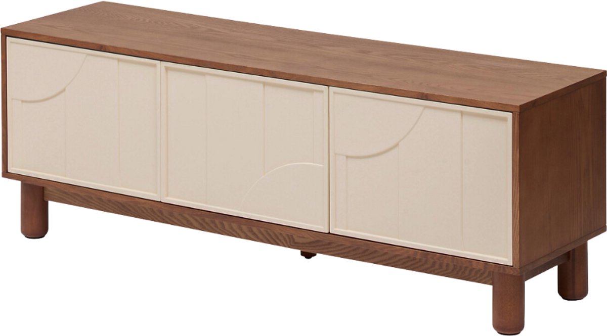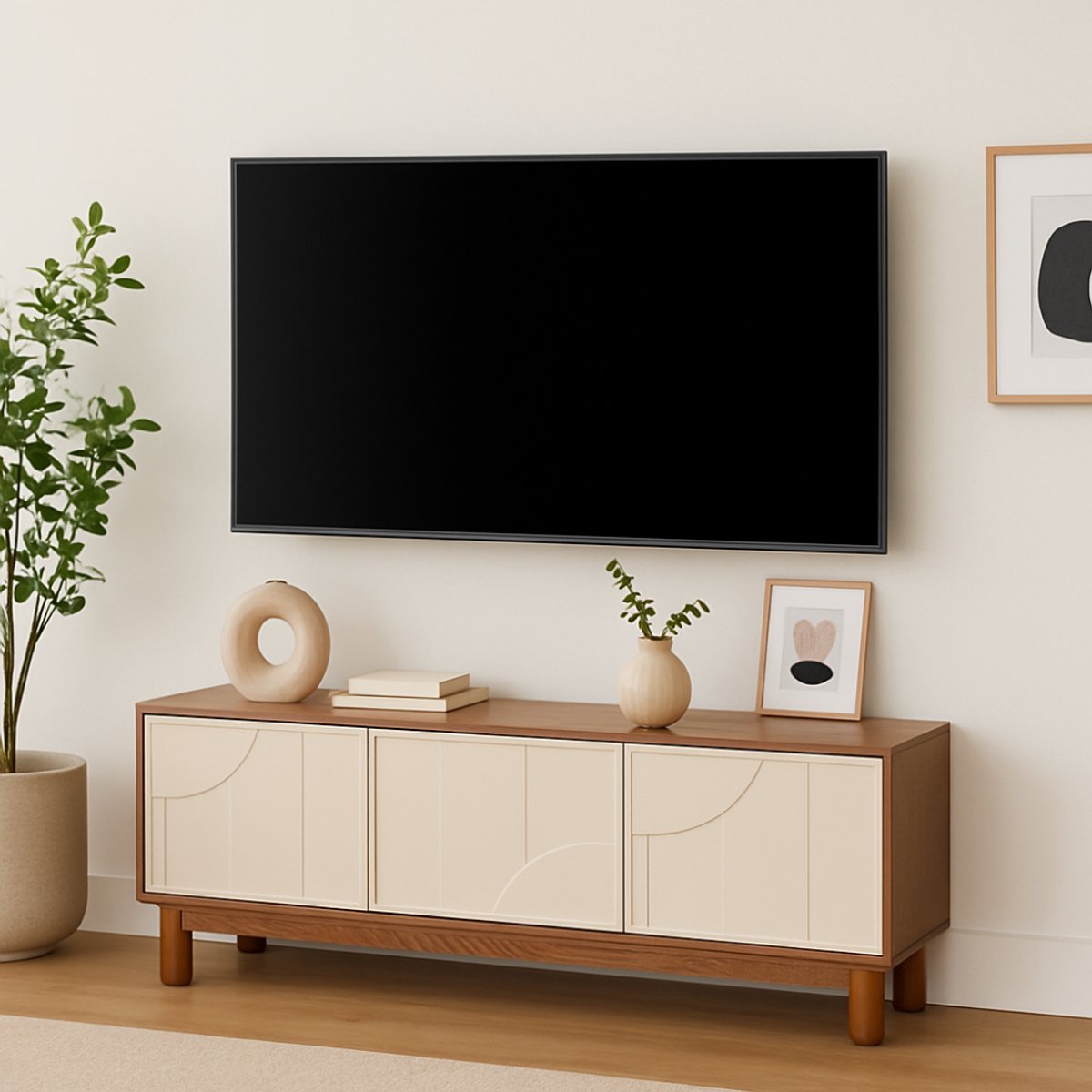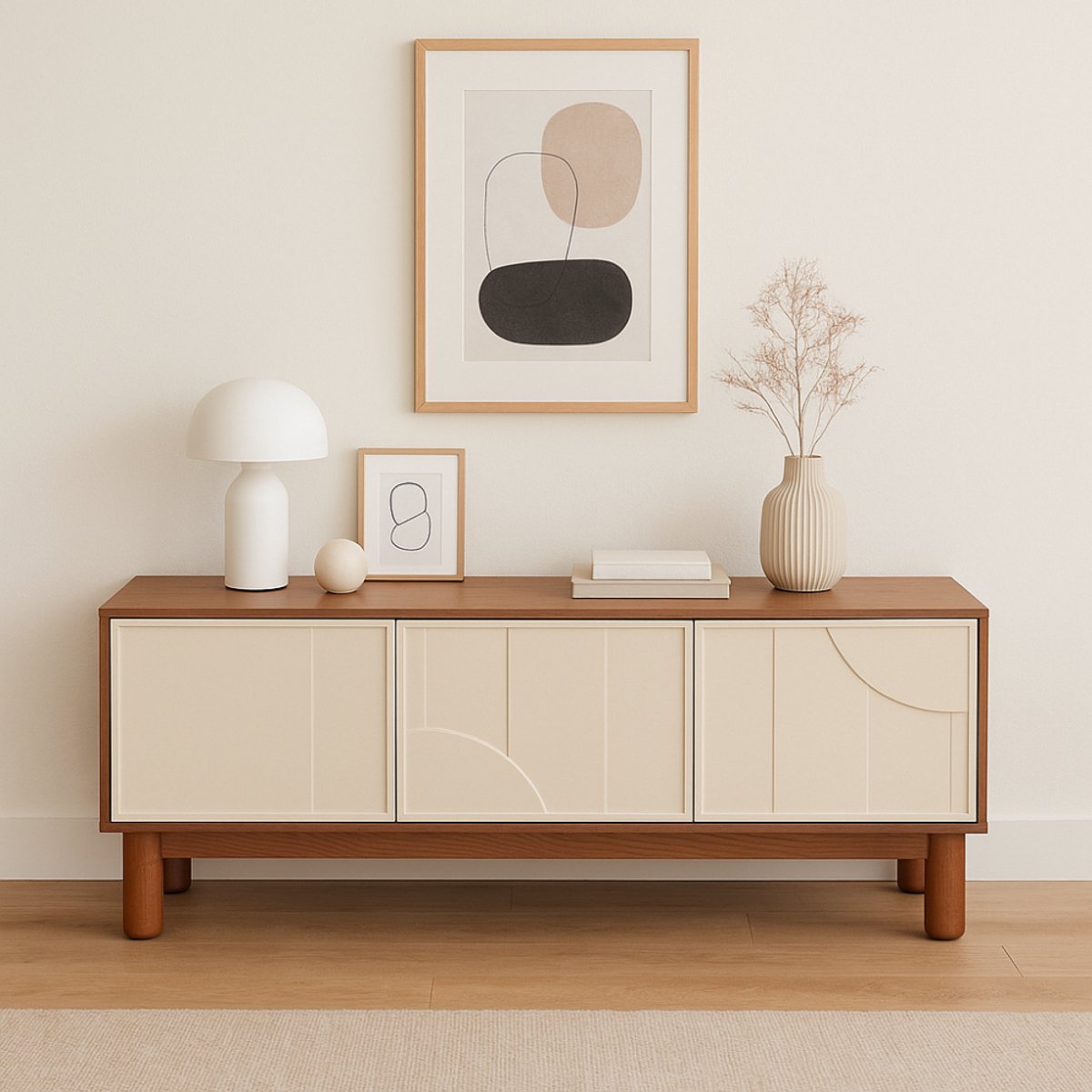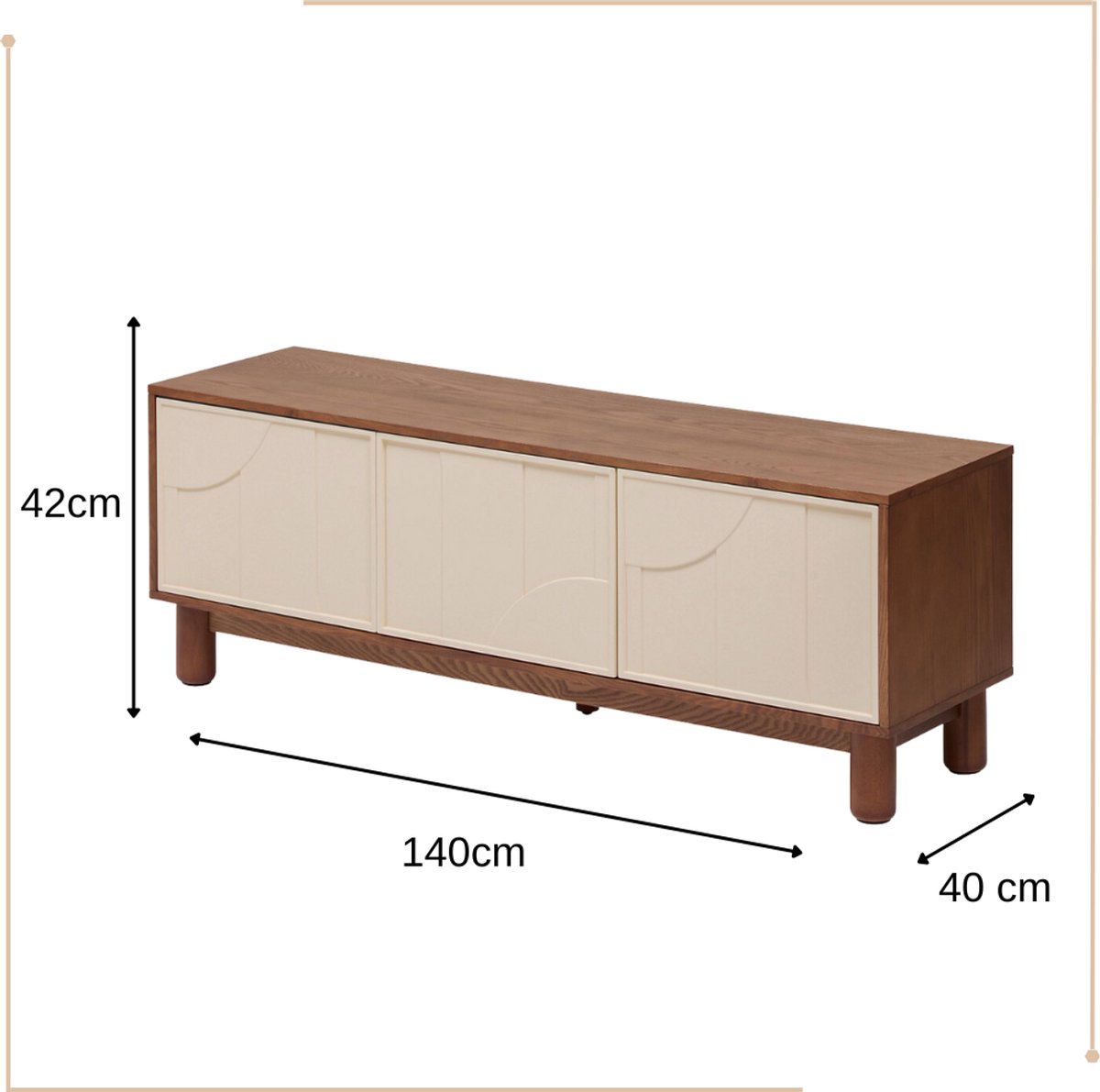 Het meubel is uitgevoerd in hout met een donkerbruine afwerking en beige details die zacht contrasteren. De organische vormen en afgeronde lijnen geven een retro uitstraling zonder overdadig te worden. Het lage, brede formaat (140 x 40 x 42 cm) zorgt ervoor dat het meubel niet te hoog oogt en goed werkt met moderne platte televisies en lage zithoeken (bron: listing, gecontroleerd 2025).