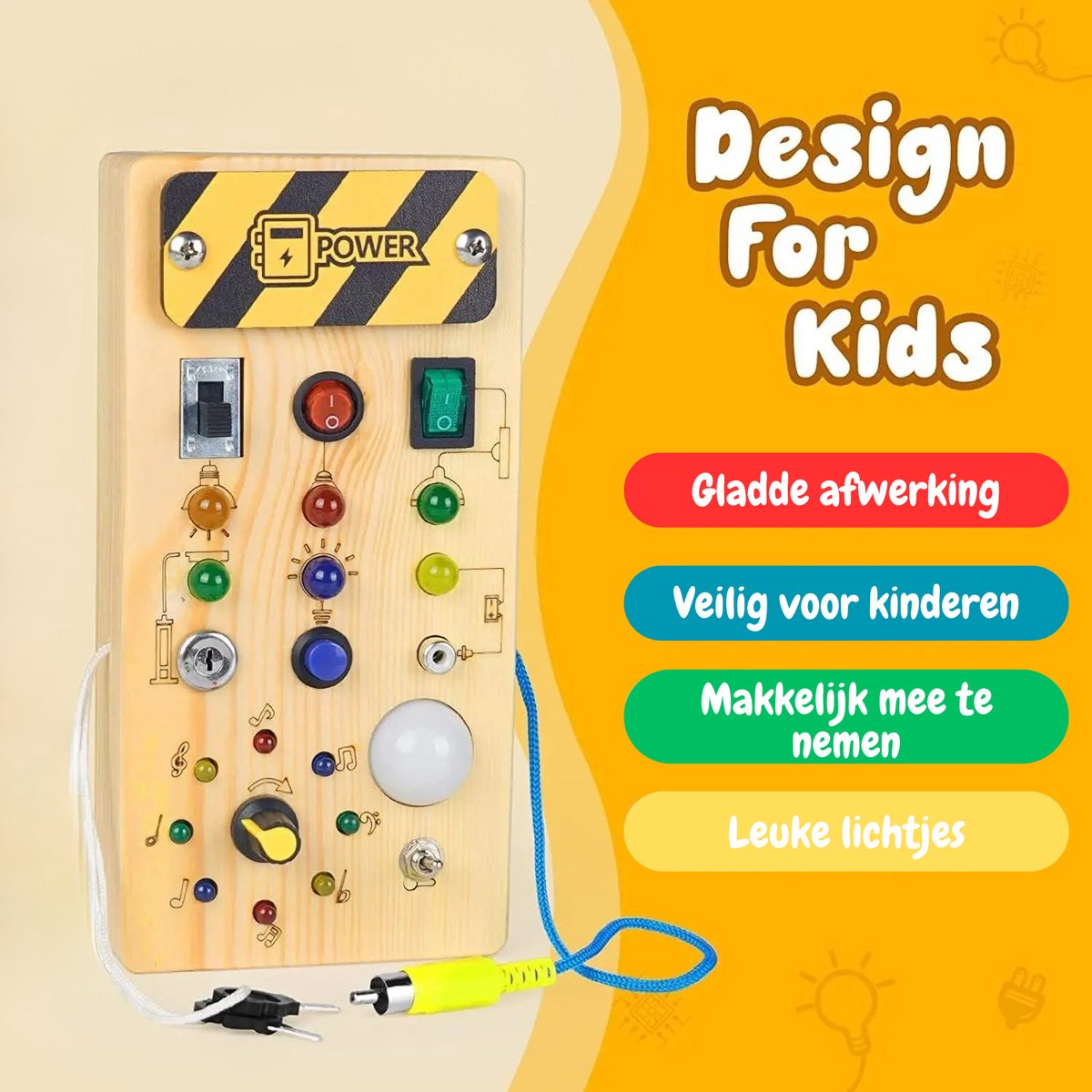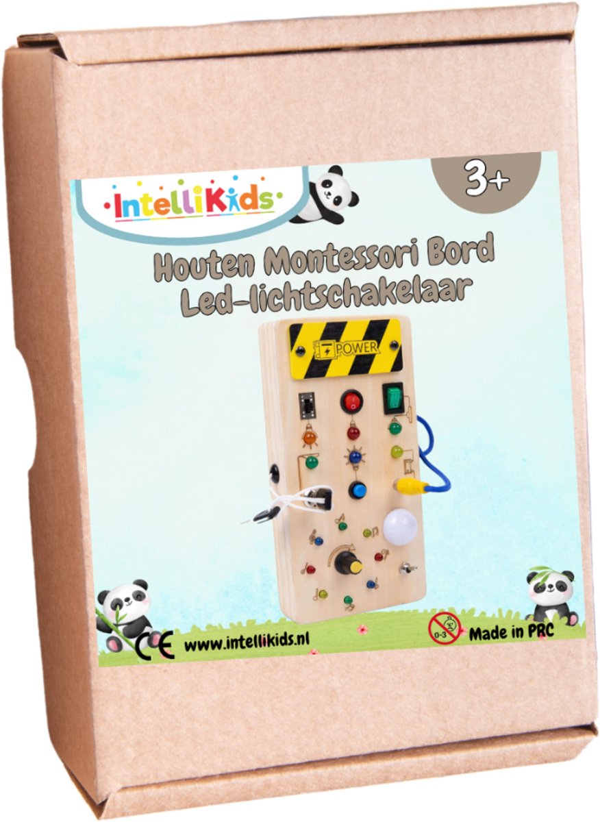 - Houten Montessori speelbord met ingebouwde interactieve elementen (volgens de productvermelding: 8 schakelaars, 15 ledlampjes, diverse draaiknoppen, stekkers en slotjes)