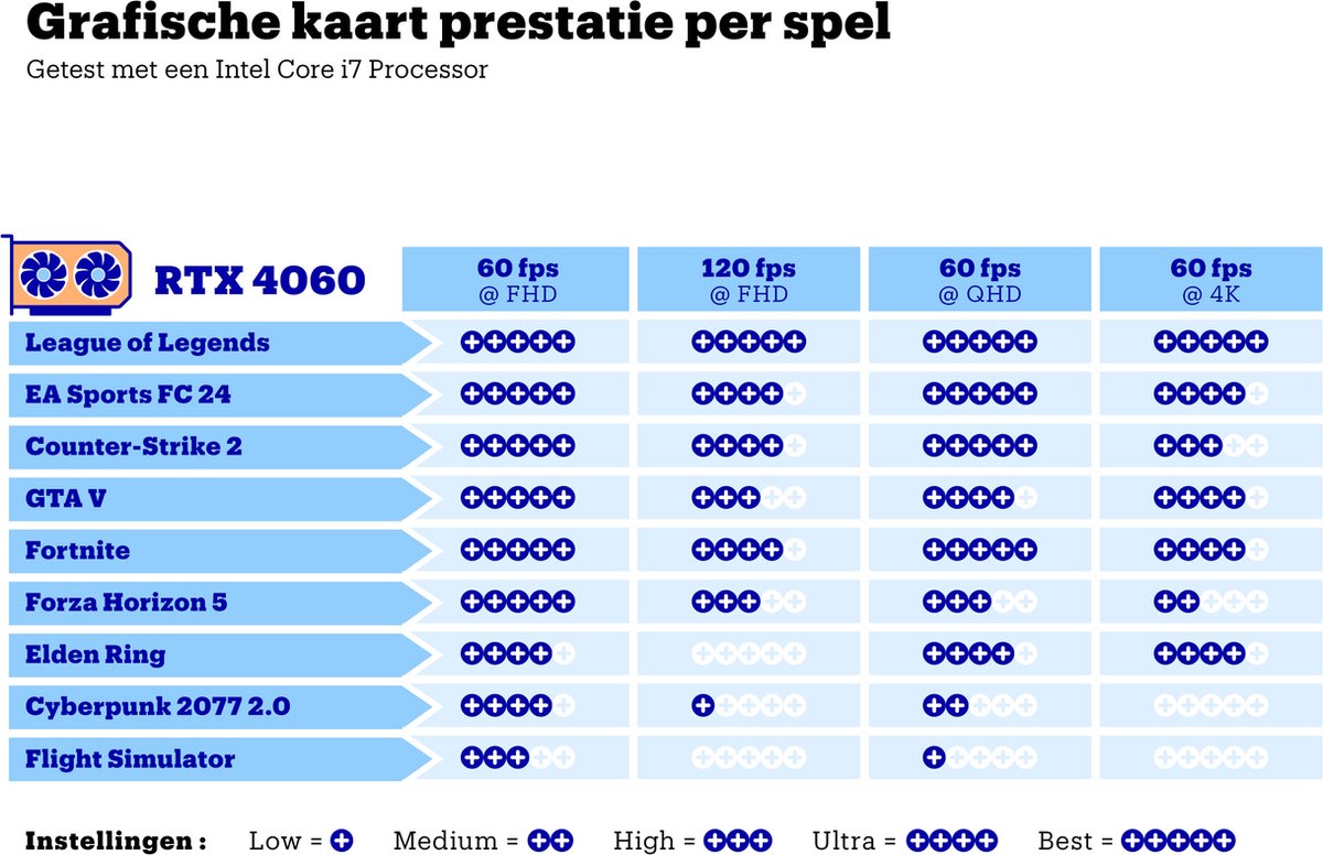 - Speelstijlen en genres: volgens de verkoper zijn sport-, indie‑, RTS‑, avontuur‑, simulatie/strategie‑, MOBA‑, MMO‑ en racegames goed te spelen op hoge tot ultrahoge instellingen. First-person shooters draaien volgens de verkoper goed op middelmatige instellingen. Deze verdeling sluit aan bij de praktijk: voor e-sport shooters verkies je vaak lagere instellingen om maximale framerates en consistentie te behalen, terwijl singleplayer AAA’s op hoge setting in Full HD erg mooi en soepel kunnen zijn.