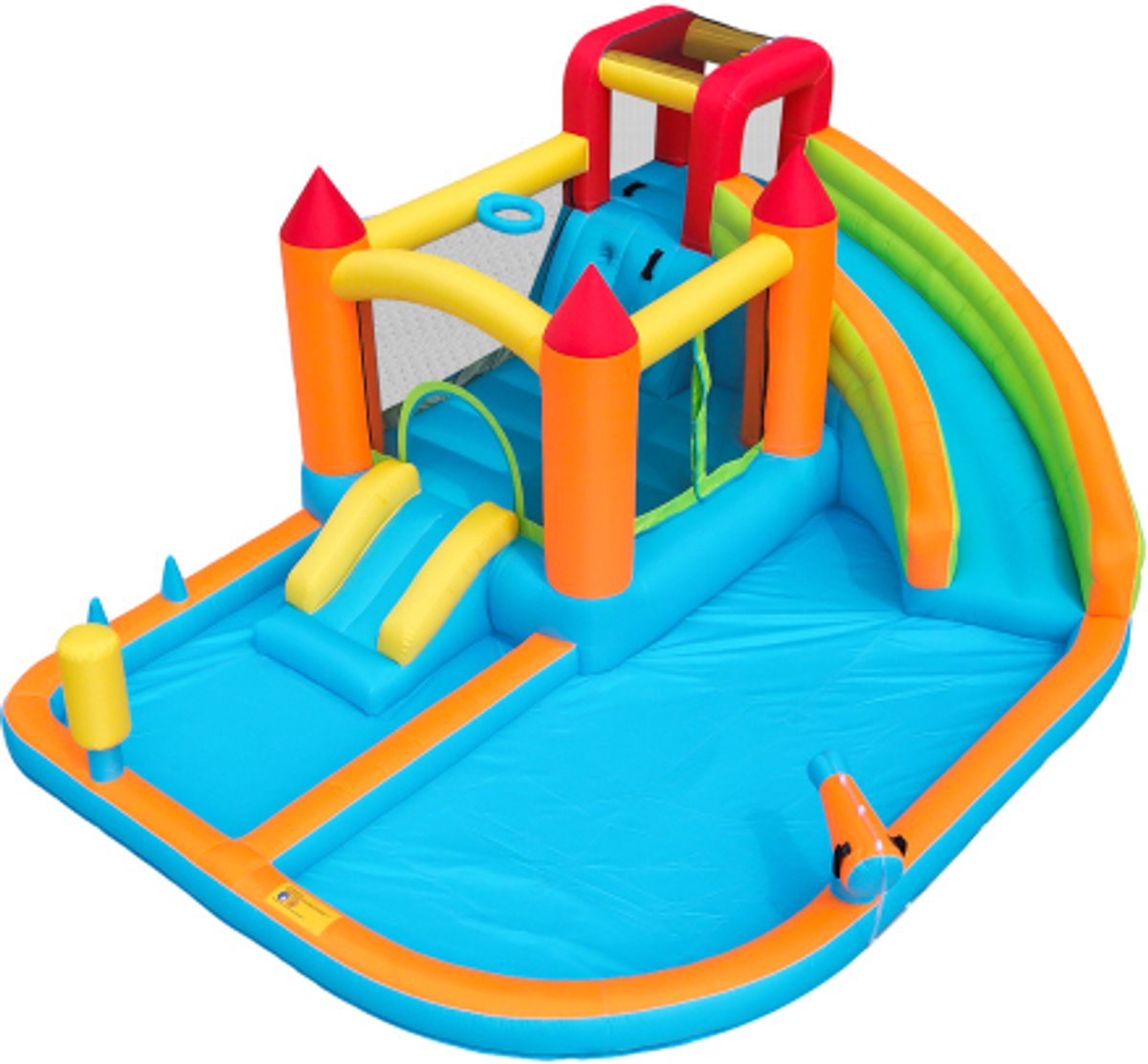 Dit is een multifunctioneel opblaasbaar speeltoestel voor kinderen: een kleurrijk springkussen met toevoegingen zoals een waterglijbaan, trampolinegedeelte, basketbalkorf en diverse spelaccessoires. Het product richt zich op gezinnen met jonge kinderen die thuis willen spelen, verjaardagen of buurtfeestjes organiseren, en ouders die een variant zoeken die in zowel droge als natte omstandigheden gebruikt kan worden.