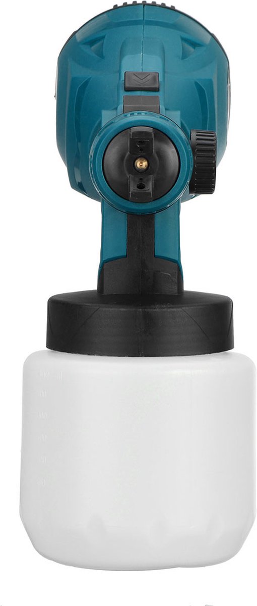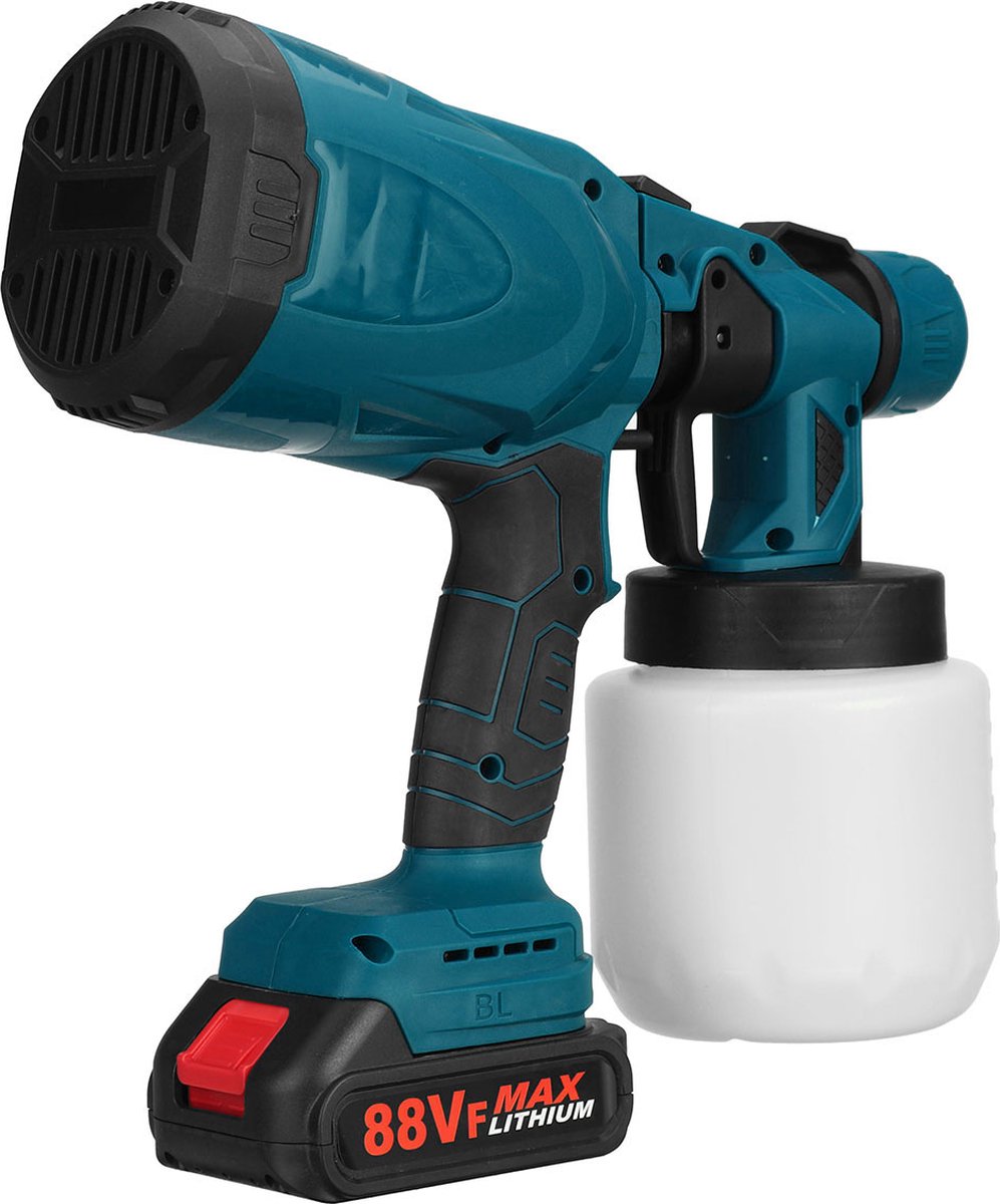 De verfspuit wordt gevoed door een accu en is volgens de specificatie compatibel met een Makita 18V batterij. Dat geeft mobiliteit: handig in de tuin, op de oprit of op een steiger waar geen stopcontact is. Als je al een Makita 18V accu bezit, kun je die inzetten zonder nieuwe accu’s te hoeven aanschaffen. Over meegeleverde accu of oplader wordt niets gezegd; reken erop dat je eigen Makita 18V accu nodig is en check de productpagina voor bundels als je nog geen accu hebt.