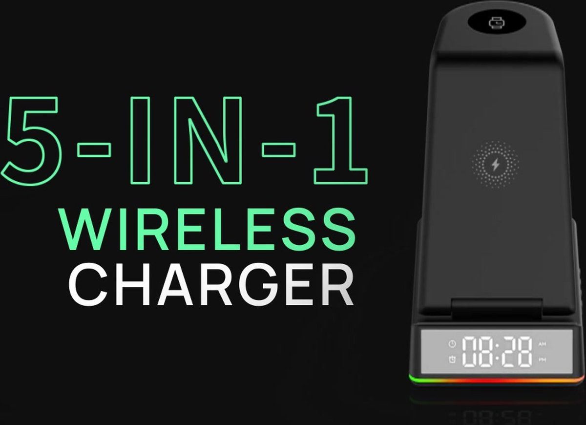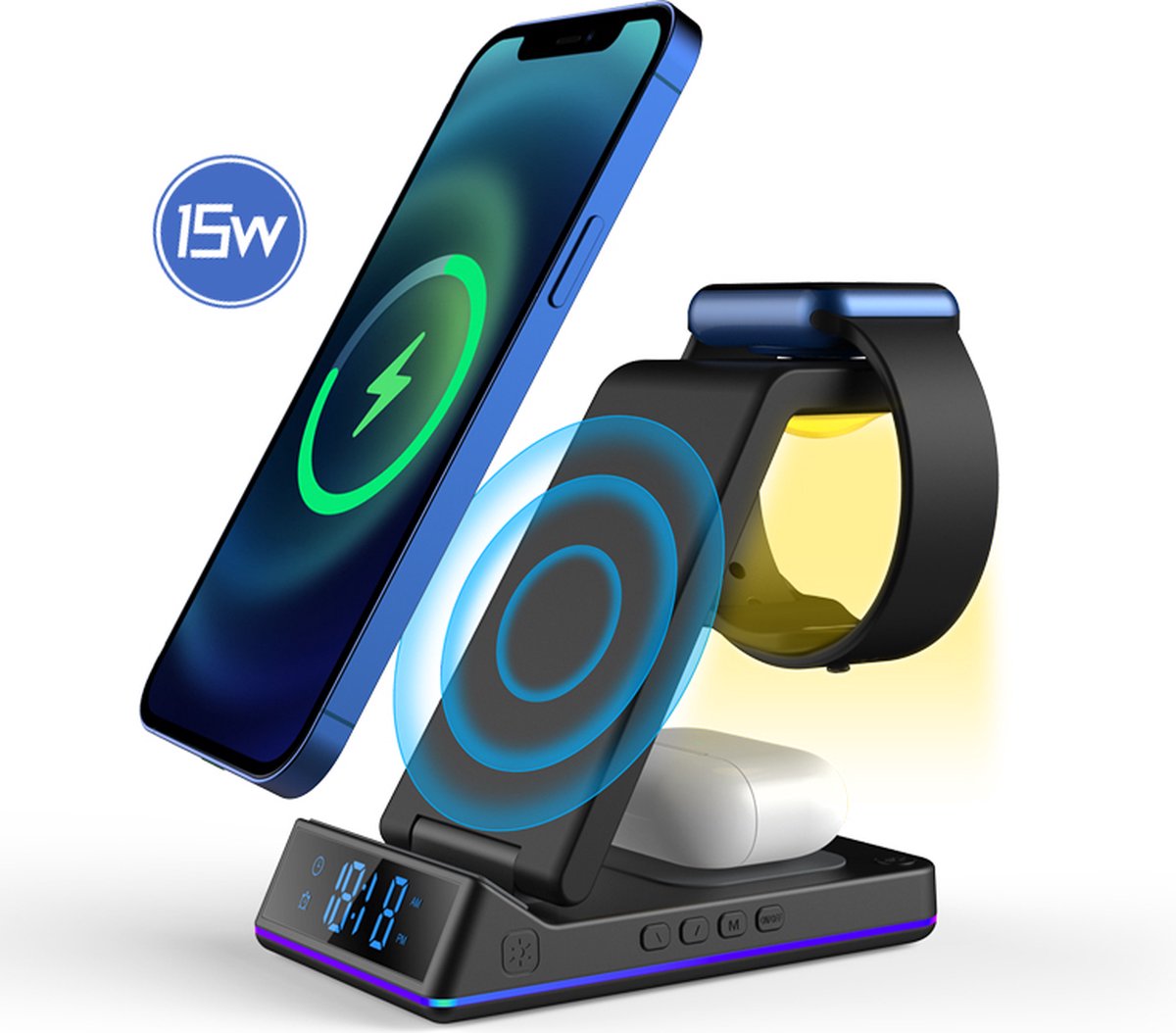 De 5 in 1 draadloze oplader is een multifunctioneel laadstation dat smartphones, een Apple Horloge en AirPods tegelijk kan bijtanken — met extra functies als klok, wekker en nachtlampje. Het richt zich op mensen die hun nachtkastje willen opruimen en meerdere apparaten overzichtelijk en veilig willen opladen.