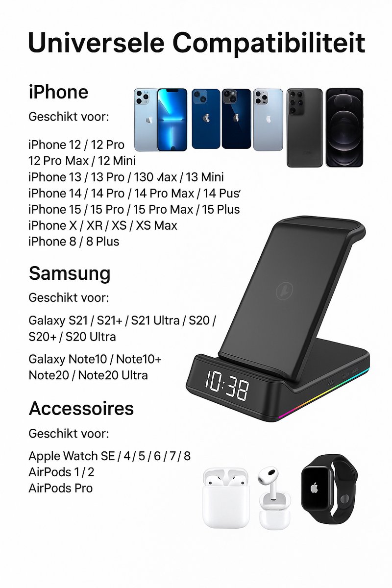 Dit laadstation combineert draadloos opladen voor telefoons, een dedicated Apple Horloge-oplaadstand, een AirPods-laadzone, plus een klok/wekker en nachtlampje. In de praktijk betekent dit minder losse kabels en een georganiseerde nachtkastopstelling — ideaal voor mensen die ’s ochtends snel willen vertrekken zonder verschillende kabels te moeten zoeken.