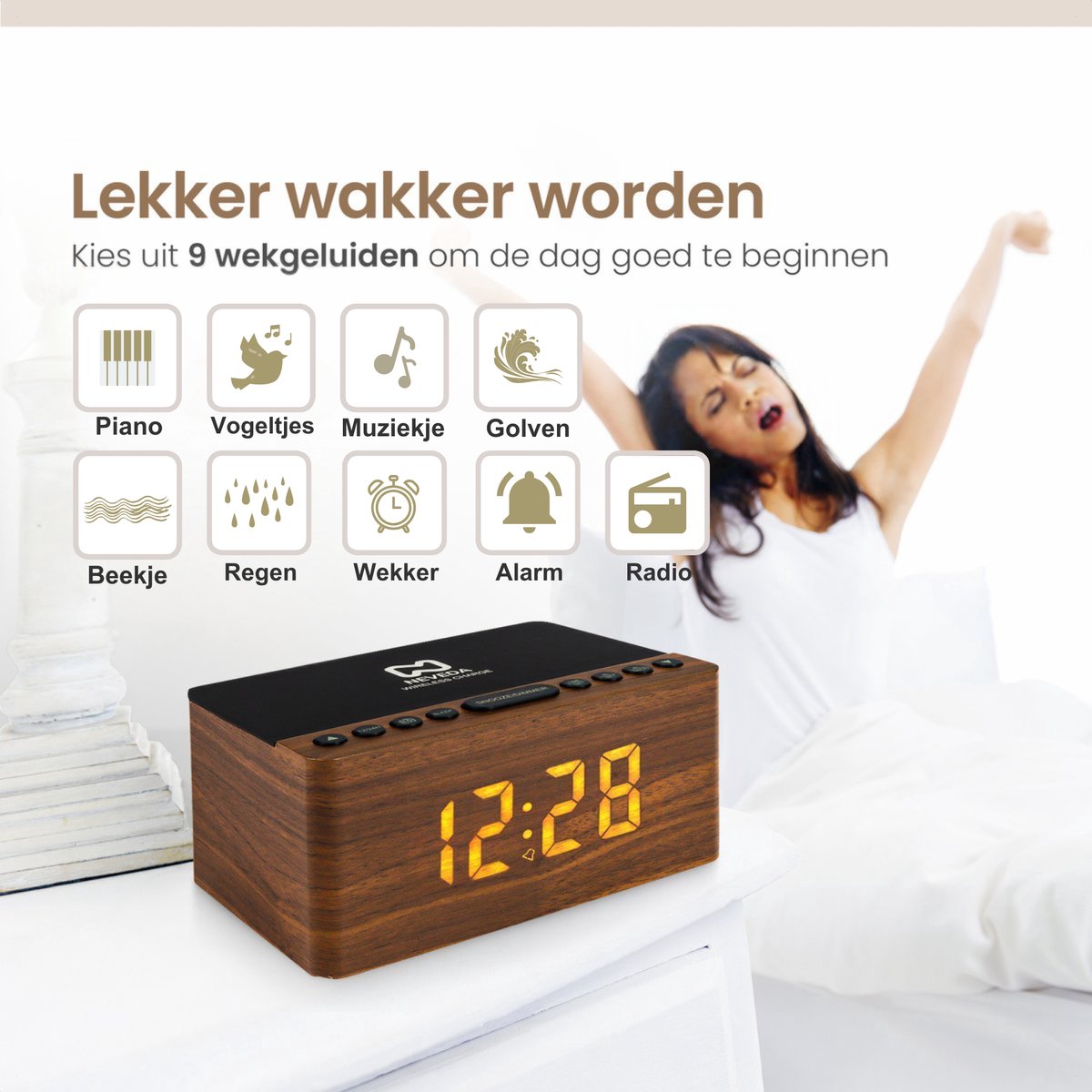 De Neveda wekker is een alles-in-één nachtkastje: wekker, FM-radio en draadloze oplader in één apparaat. Hij richt zich op mensen die hun ochtendrust willen verbeteren met eenvoudige bediening, zachte wekgeluiden en een overzichtelijk display. Voor wie een compacte, multifunctionele oplossing zoekt zonder veel snufjes, biedt deze wekker veel relevante functies.