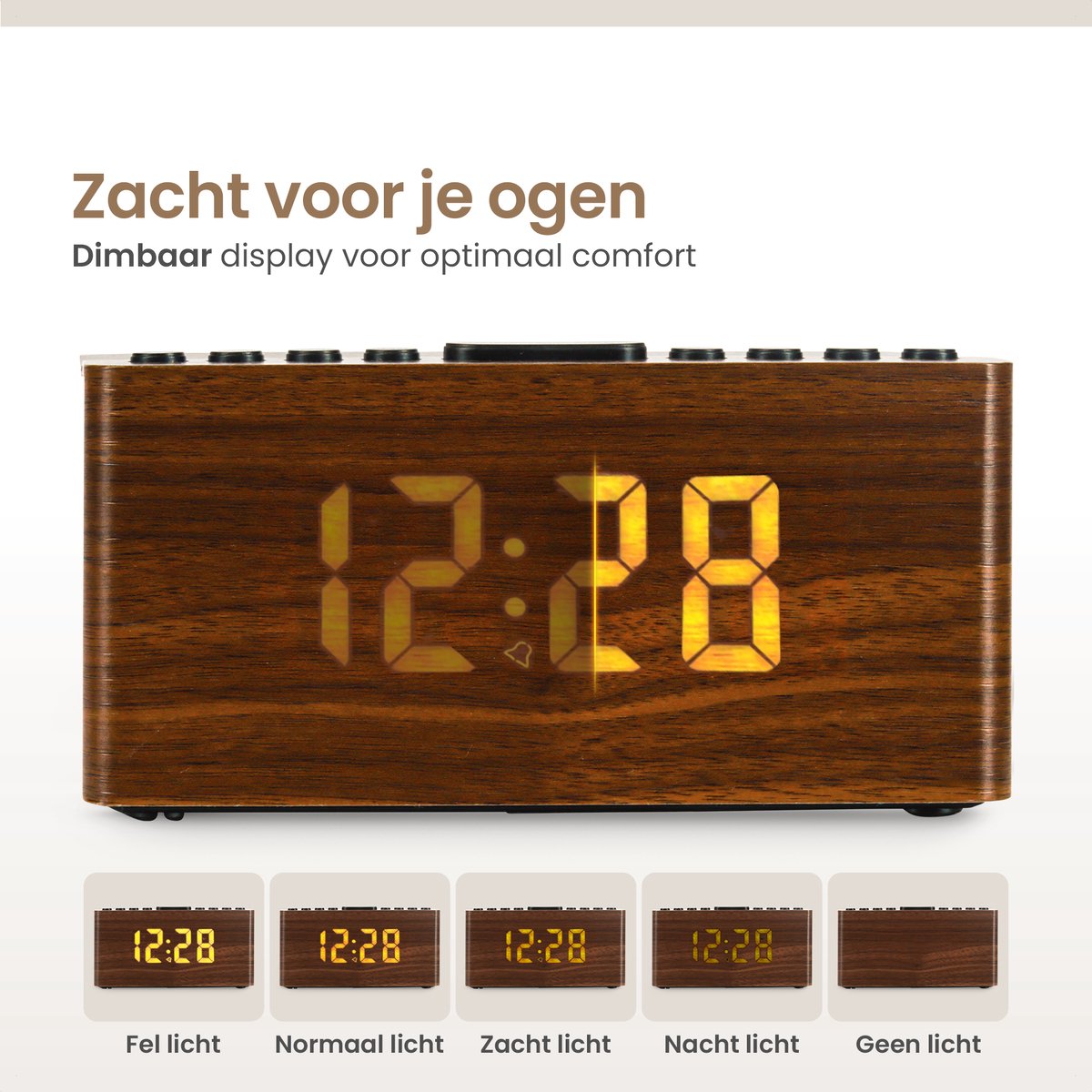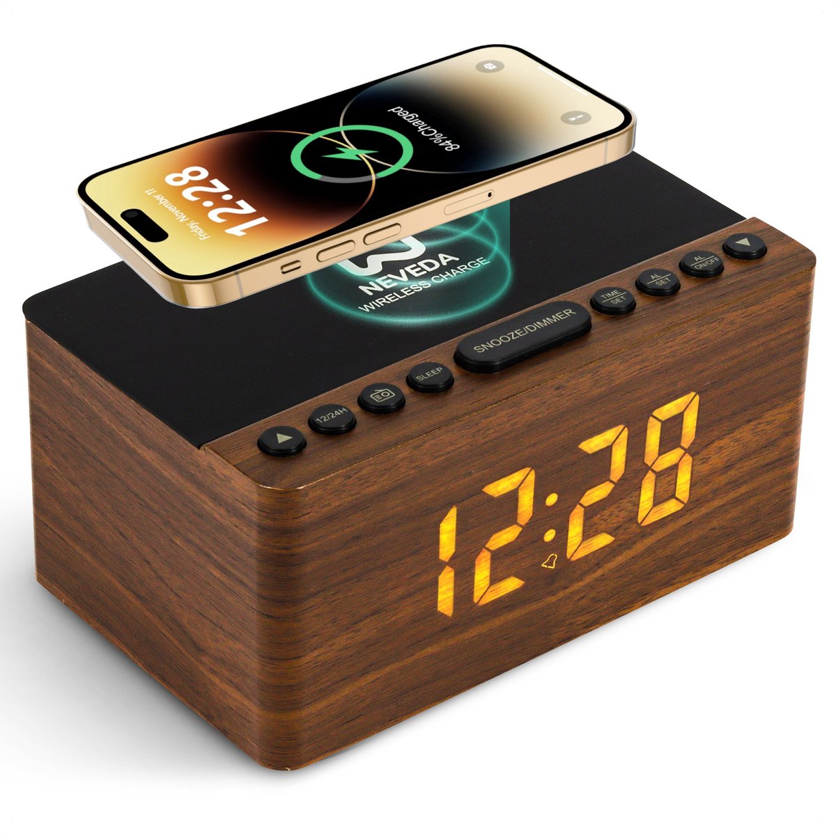De Neveda wekker is een praktische, gebruiksvriendelijke keuze voor wie orde en rust op het nachtkastje wil: een groot display met vijf dimstanden, negen wekgeluiden en de mogelijkheid om tot 30 FM-zenders te bewaren maken het geschikt voor een ontspannen start van de dag (source: listing, checked 2025). De combinatie met een draadloze oplader en extra USB‑poort verkleint de hoeveelheid losse kabels en adapters naast je bed.