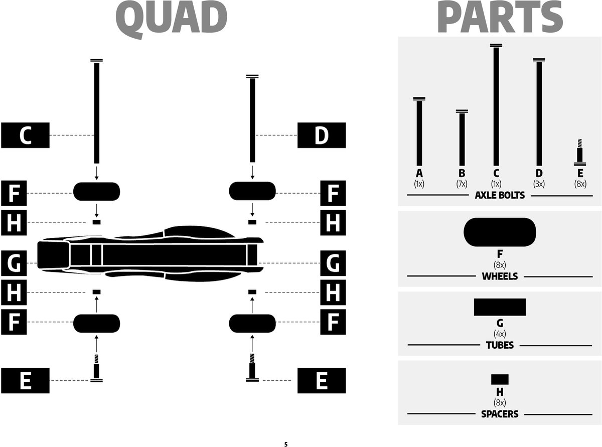 - Verwissel wielsysteem tussen quad, trike en skeeler met twee inbussleutels.
