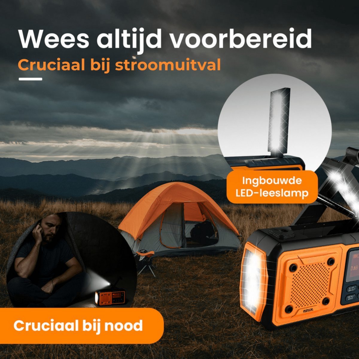 De Nince noodradio is een compacte, multifunctionele radio ontworpen om je van informatie en stroom te voorzien bij buitenactiviteiten en noodsituaties. Hij combineert meerdere laadopties (zonnepaneel, handslinger en batterijen) met digitale en analoge ontvangst, verlichting en een powerbankfunctie.