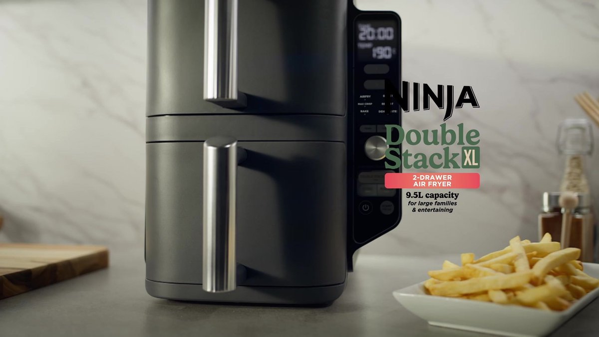 Ninja presenteert een dubbele airfryer die verticaal stapelt: ideaal voor keukens met weinig aanrechtruimte. Met twee lades van 4,75 liter bereidt u hoofd- en bijgerechten tegelijk, zonder concessies aan knapperigheid.