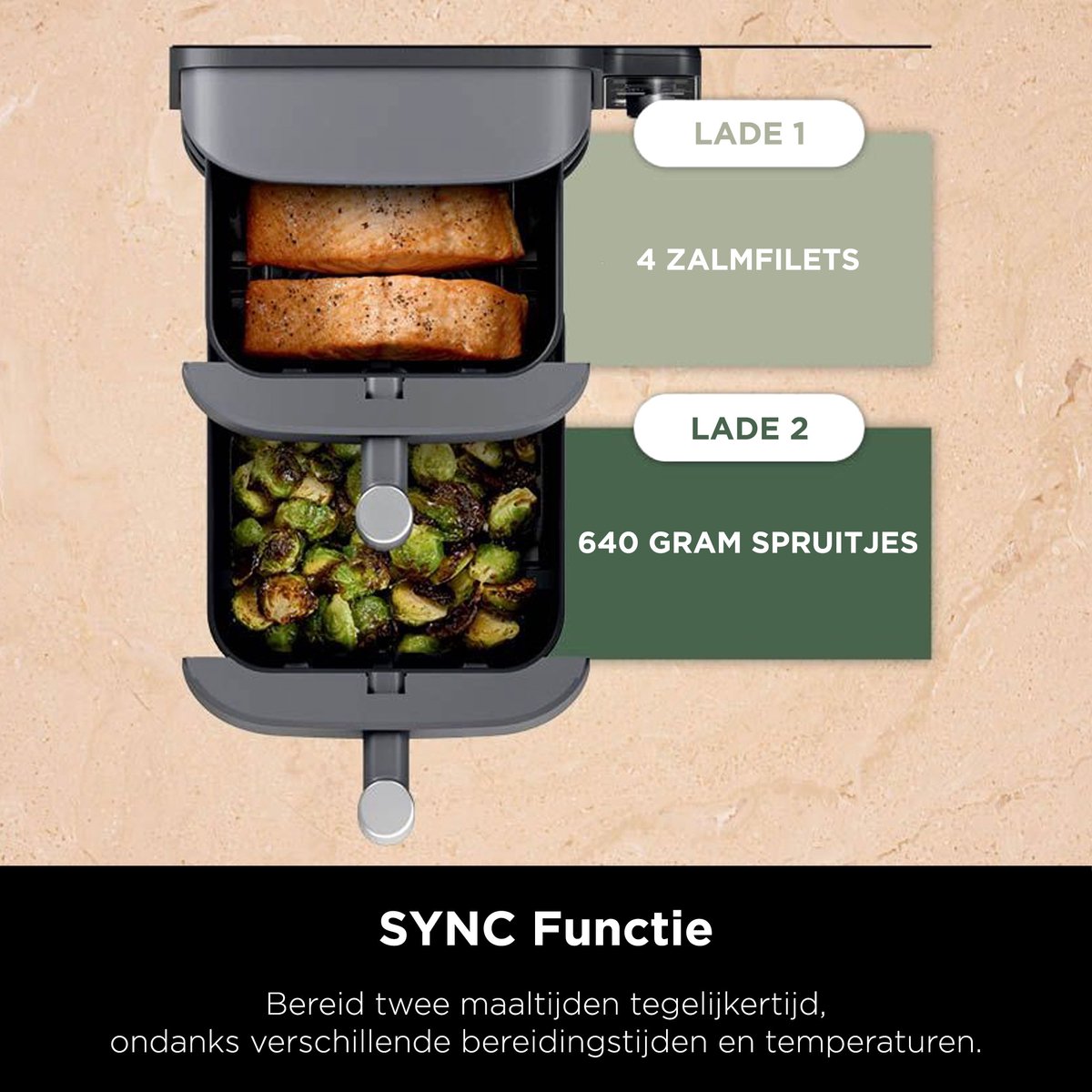 Je kunt in elke lade een andere kookfunctie, temperatuur en tijd instellen. Dat geeft vrijheid om bijvoorbeeld zalm op een lagere temperatuur te bereiden, terwijl aardappeltjes in de andere lade heter en knapperig worden. Met de sync‑functie zorg je dat beide lades tegelijk klaar zijn, ook als de ingestelde tijden verschillen. Ideaal om hoofd- en bijgerechten samen te serveren.