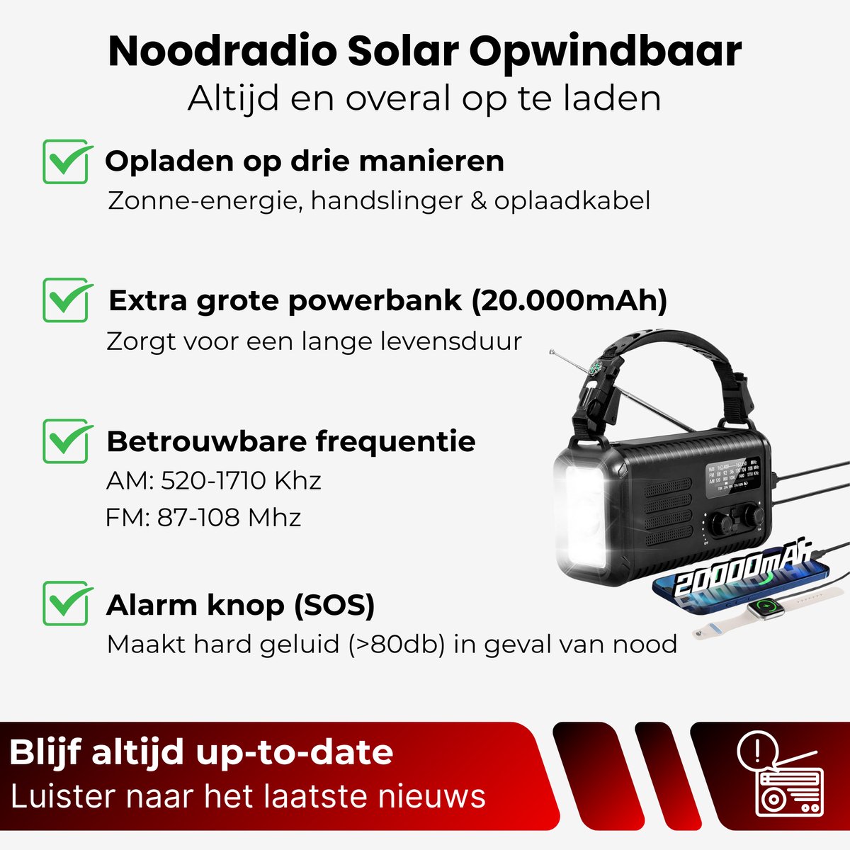 Overzicht:Deze complete noodset bevat een noodradio met 20.000mAh, ideaal voor Nederlandse huishoudens die voorbereid willen zijn. Met zonne-oplading, handslinger en kabel blijf je opgeladen en ontvang je belangrijke weer- en noodinformatie.